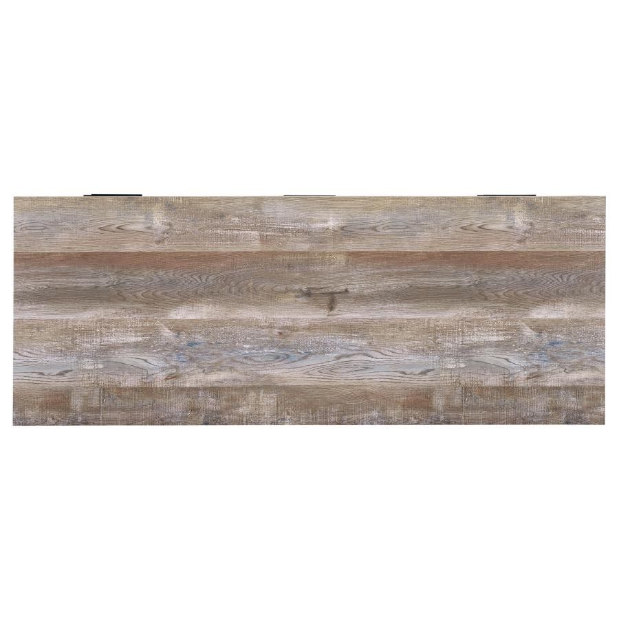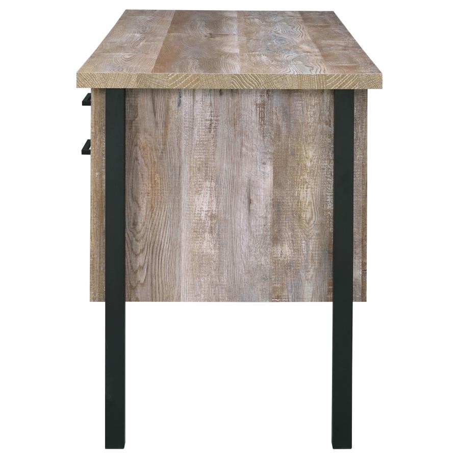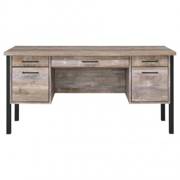 Infuse your office space with stylish simplicity. With a rustic, aged oak finish, this office desk exudes classic charm. Its strong silhouette is brought to life by crisp, clean lines of bold, black metal. Complete with five spacious storage and file drawers, this desk makes it easy to stay organized. Complete with euro glides and high-quality craftsmanship, it's the ultimate in durable practicality.