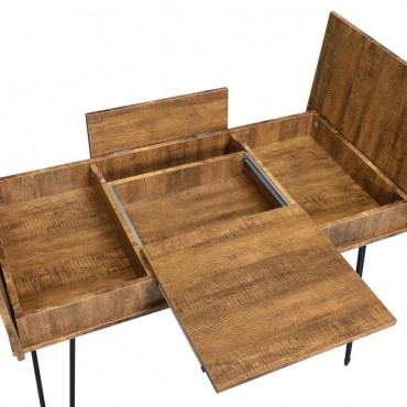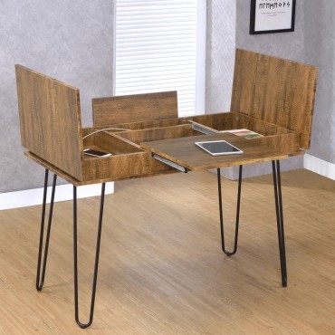 At first glance, it appears to be a simple writing desk with a hint of traditional charm. Yet when you flip open its top and pull out its sliding tray, and it reveals a plethora of pleasing features. Four spacious compartments offer discreet storage for your valuables. A built-in power outlet provides a useful charging station for electronics. With sleek, curved legs and a rustic amber finish, this versatile desk exudes convenience and class.