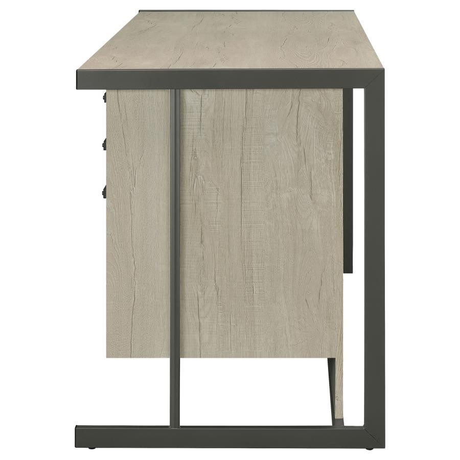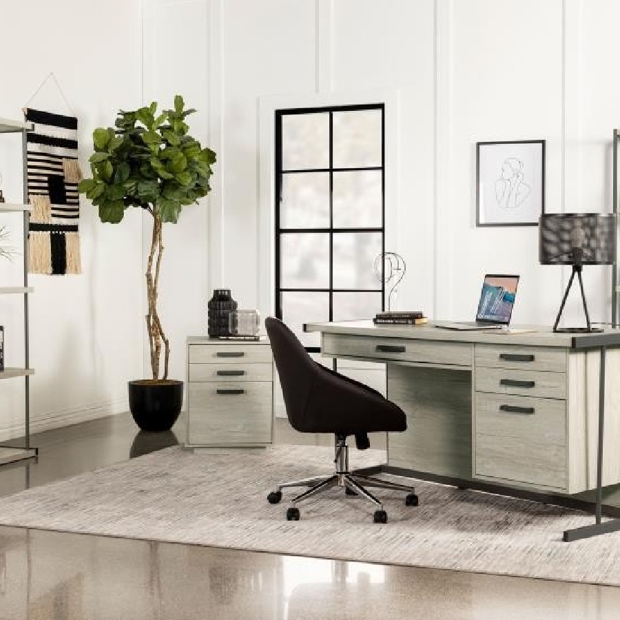 Elevate your contemporary home office and organize your supplies with this spacious contemporary office desk, featuring a light and bright whitewashed grey finish that maintains a clean look and feel to the space. Four drawers, including a deep file drawer, allow you to organize important documents, fastened with gunmetal finished pulls that coordinate with the grey finished sled style base.