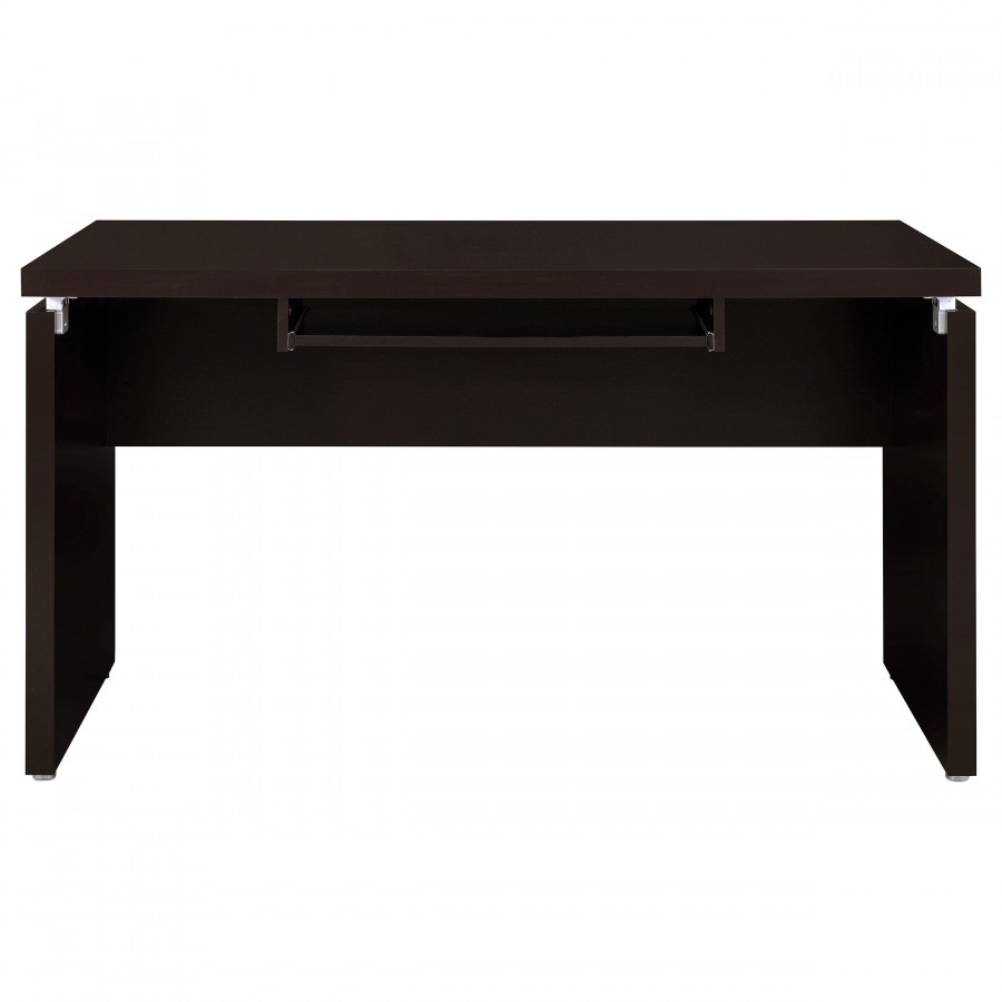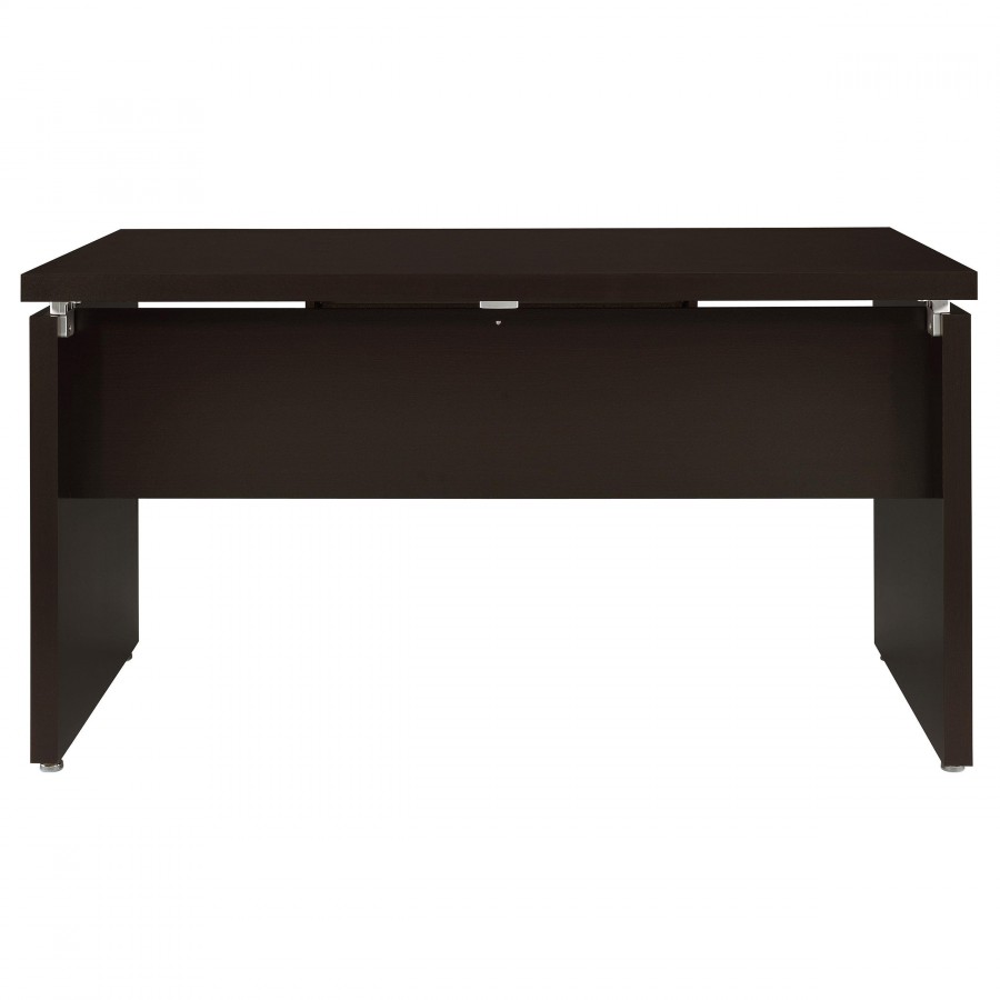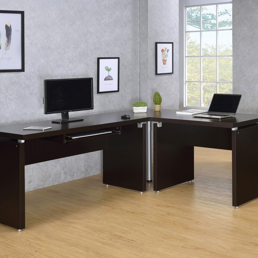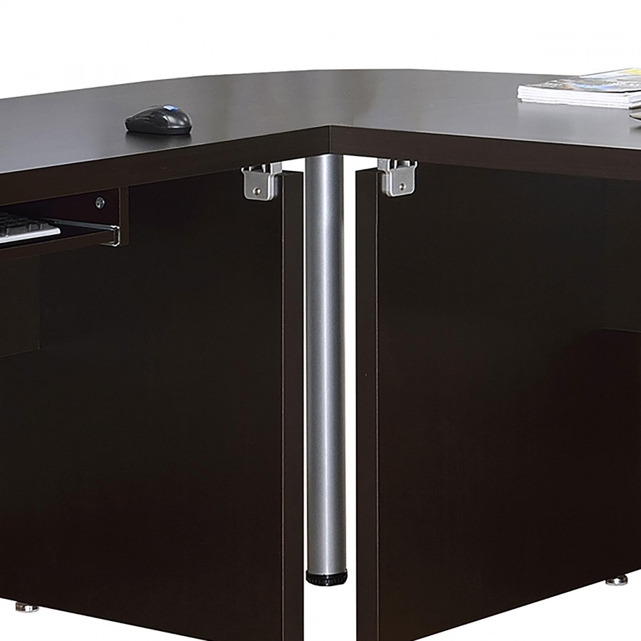 Silver hardware gleams in a modern L-shaped desk. Ideal for working from home, the desk is a spacious design complete with plenty of storage. A slide-out keyboard tray adds ergonomic appeal while multiple accessory drawers keep you organized and your desktop tidy. A rolling fil drawer provides a place for paperwork and documentation while a slim shelf space is ideal for notebooks or a reference book. A cappuccino finish is rich and elegant, offering modern flair that blends beautifully in your workspace.