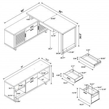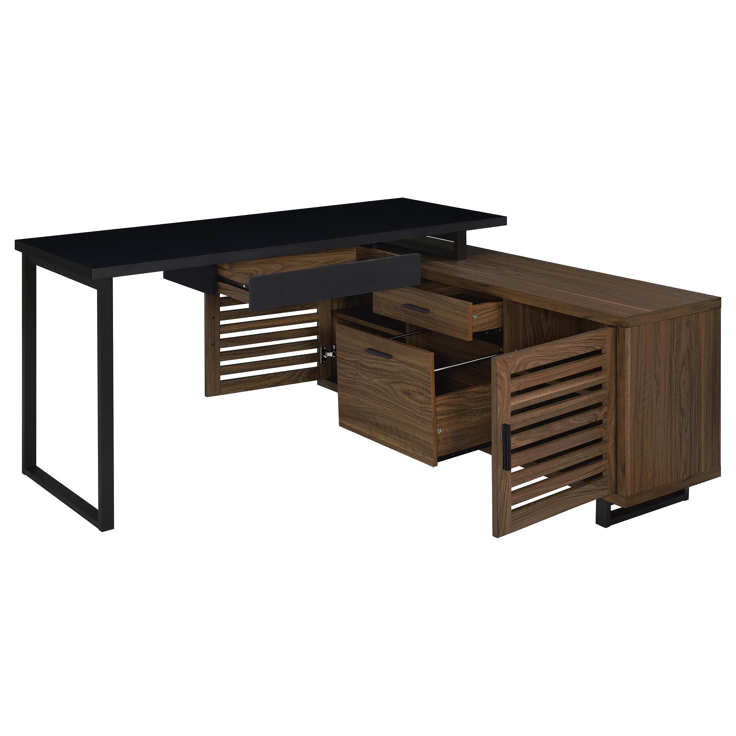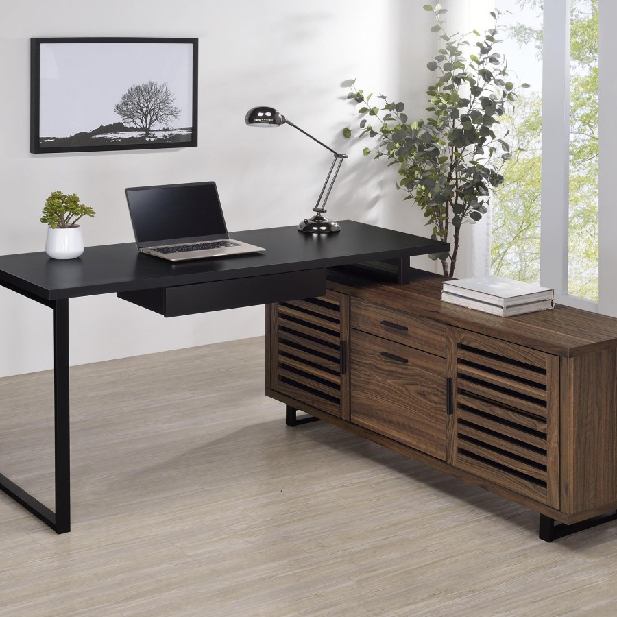 Create a custom workspace that maximizes both style and efficiency with this modern L-shaped executive desk. It features a high/low configuration, with a black finished workspace and drawer on one side and a storage credenza on the other. The credenza offers slats doors with adjustable shelving behind and center drawers for accessories. Its brown wood grain finish is made from melamine to match the black desk top, offering excellent durability. This charming desk blends into home office spaces and features metal legs that offer airy, light appeal.
