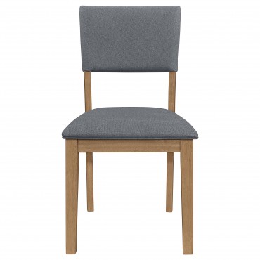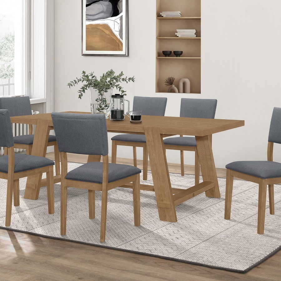 Enhance your dining room with the captivating blend of modern farmhouse style in this stunning dining side chair. The light brown frame adds a touch of warmth and rustic charm, while the blue linen-like fabric upholstery creates a vibrant and eye-catching contrast against the natural finish.