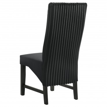 Elevate your dining space with these sophisticated dining chairs, blending textures and luxurious fabrics for a modern, elegant look. The seat back features wide channel corduroy upholstery, adding rich texture and a stylish visual contrast. The seat itself is covered in plush velvet fabric, ensuring a soft and comfortable seating experience. Supported by sturdy black-finished wooden legs, these chairs offer both durability and a sleek, contemporary silhouette. Whether for casual meals or formal gatherings, these chairs bring chic style to your dining area.