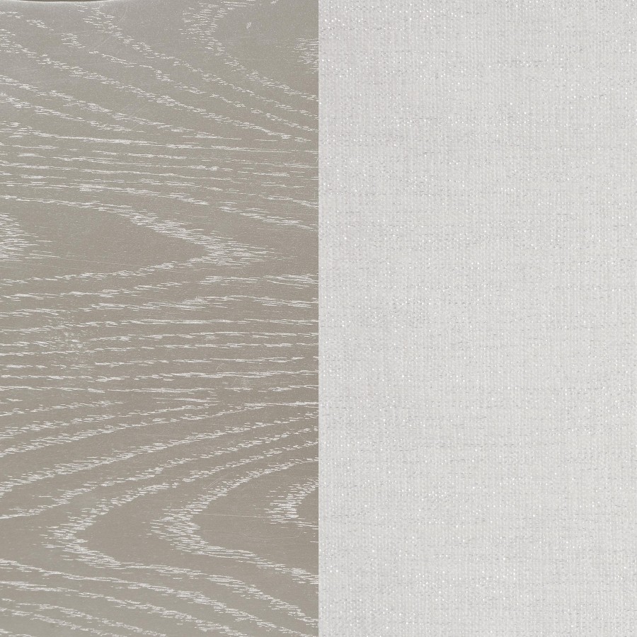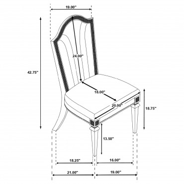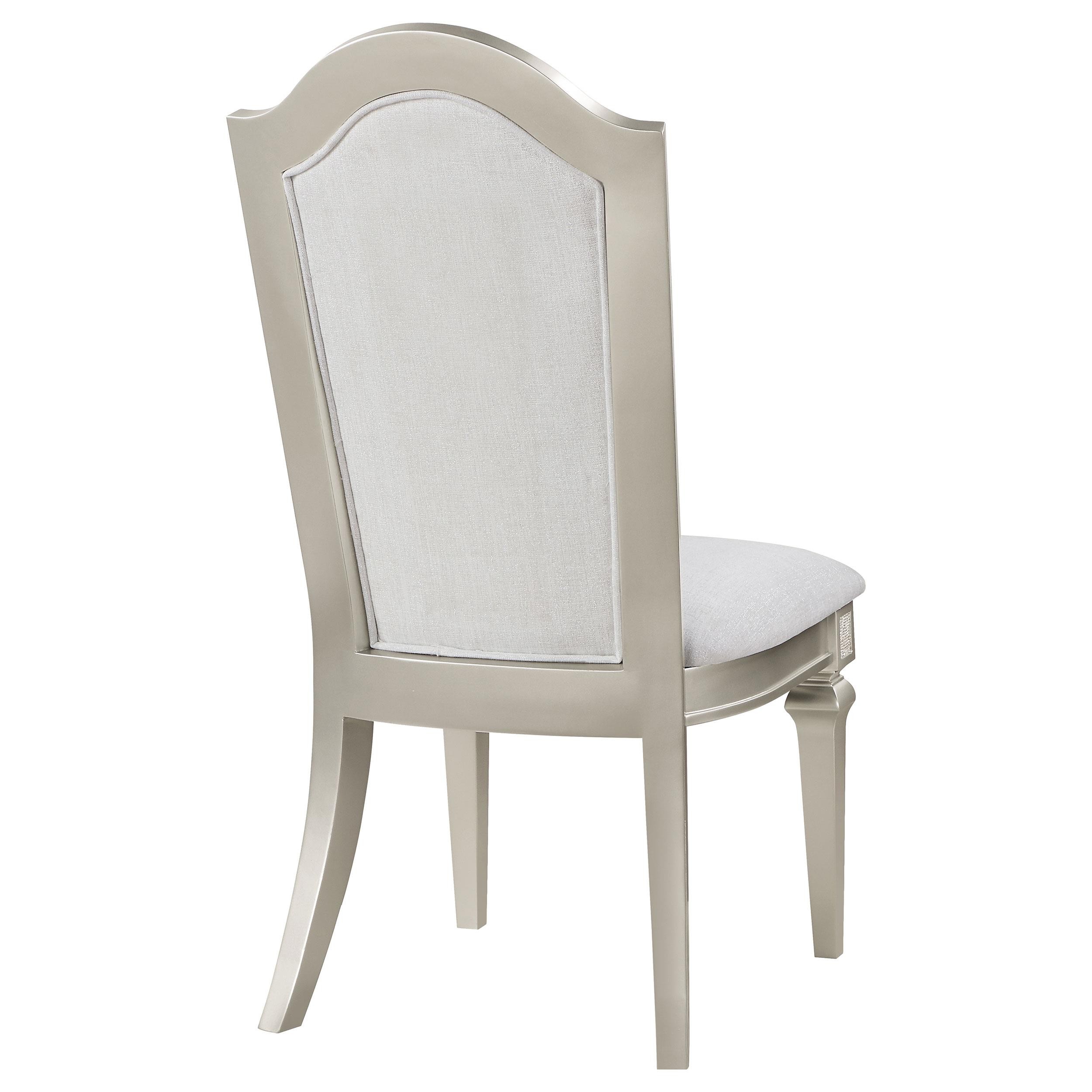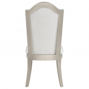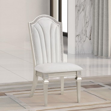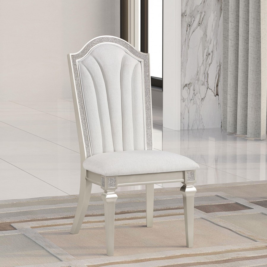 Instill modern glam sophistication in your dining room with a gorgeous set of two dining chairs. Each features a tall back with a graceful arch, establishing a regal silhouette suitable to your formal dining table. Soft ivory chenille upholstery and plush padding create a sumptuous seating experience, while vertical tufting in the seat back adds texture and drama. Tapering front legs are augmented with decorative panels that feature glittering diamond-like trim, a perfect match for the trim outlining the seat back. Sparkling in the light, the diamond trim is perfectly complemented with a chic silver oak finish that epitomizes the sophisticated, glamorous look and feel of this set of side chairs.