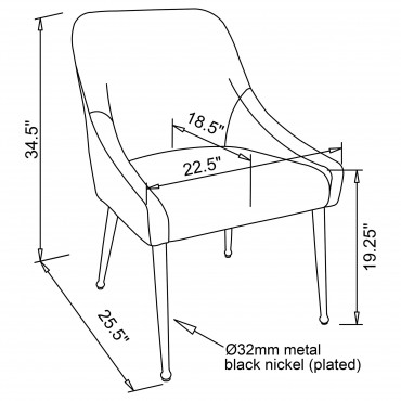 Cradle yourself in the embrace of opulence with this Italian style modern dining side chair, where comfort meets sophistication. Its plated metal legs, tapering into geometric spheres, create a foundation that's as sturdy as it is striking. The seat, a haven of luxury, boasts sloped arms and plush velvet upholstery that beckon you to linger longer after the meal has ended. A purposeful handle on the chair back not only adds to the aesthetic charm but also serves in practical motion, inviting ease with a touch of elegance. This chair is a statement piece, ready to elevate the dining experience and infuse your space with a blend of retro inspiration and contemporary flair.