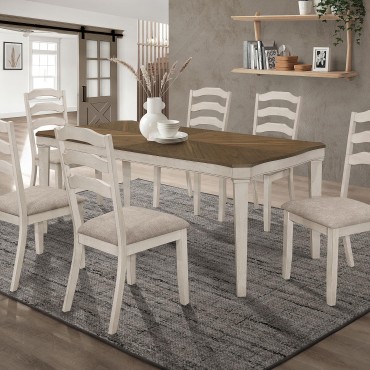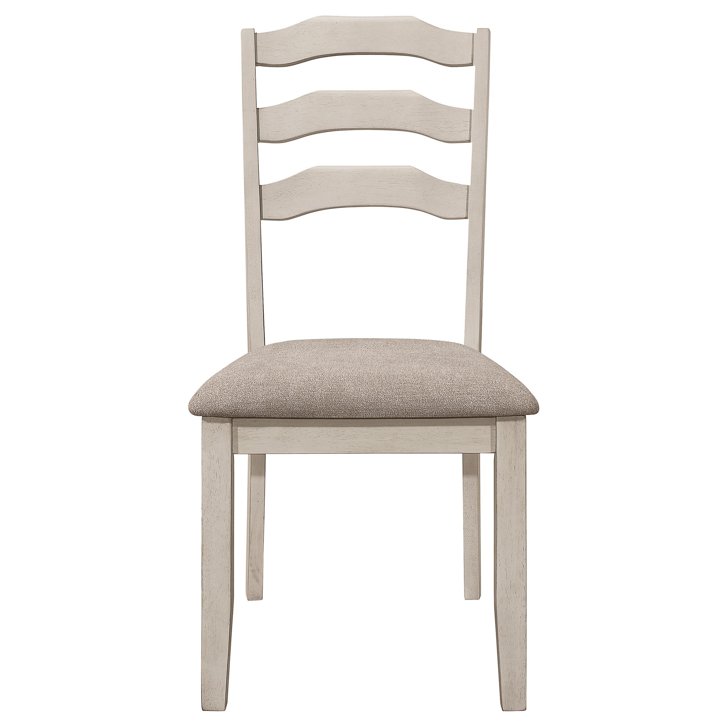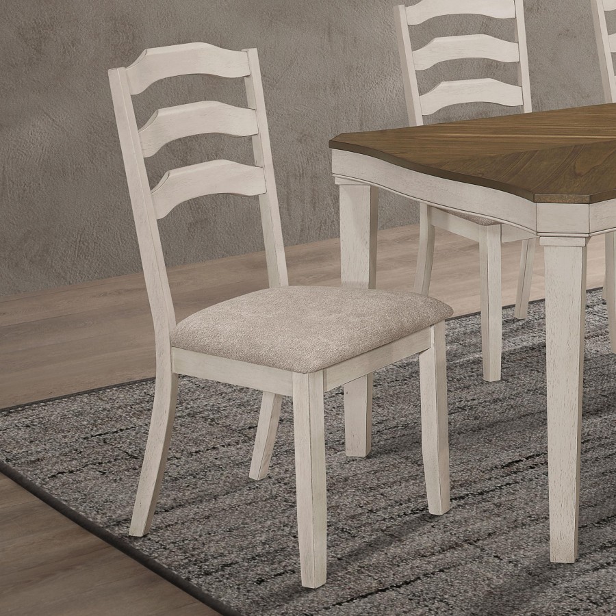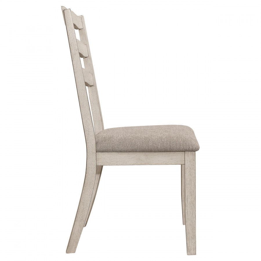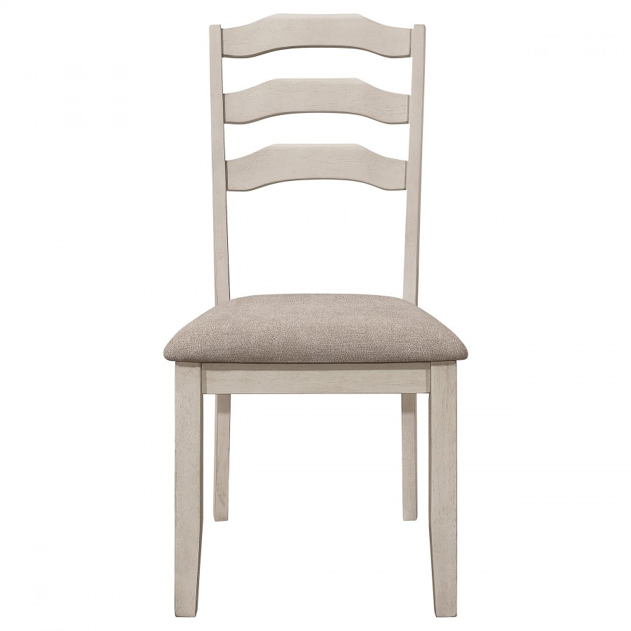 Enhance the cozy atmosphere of your dining space with our modern farmhouse and coastal cottage dining side chairs. These ladder back chairs exude a charming rustic appeal with their distressed cream finish on the legs and back. The khaki polyester fabric upholstered seat ensures optimal comfort during meals.