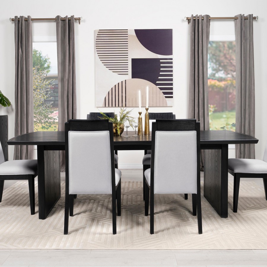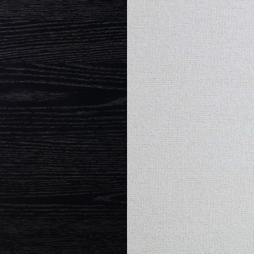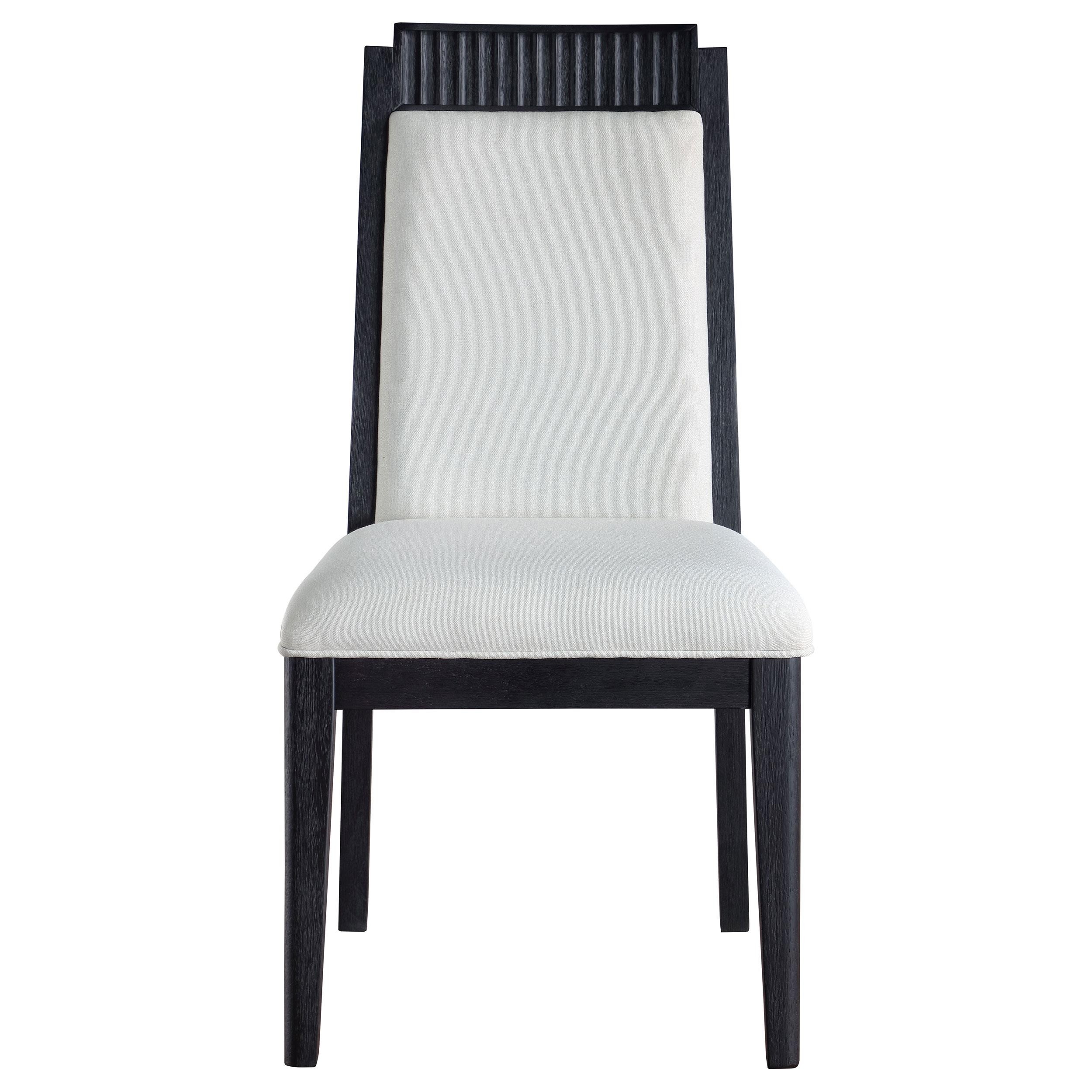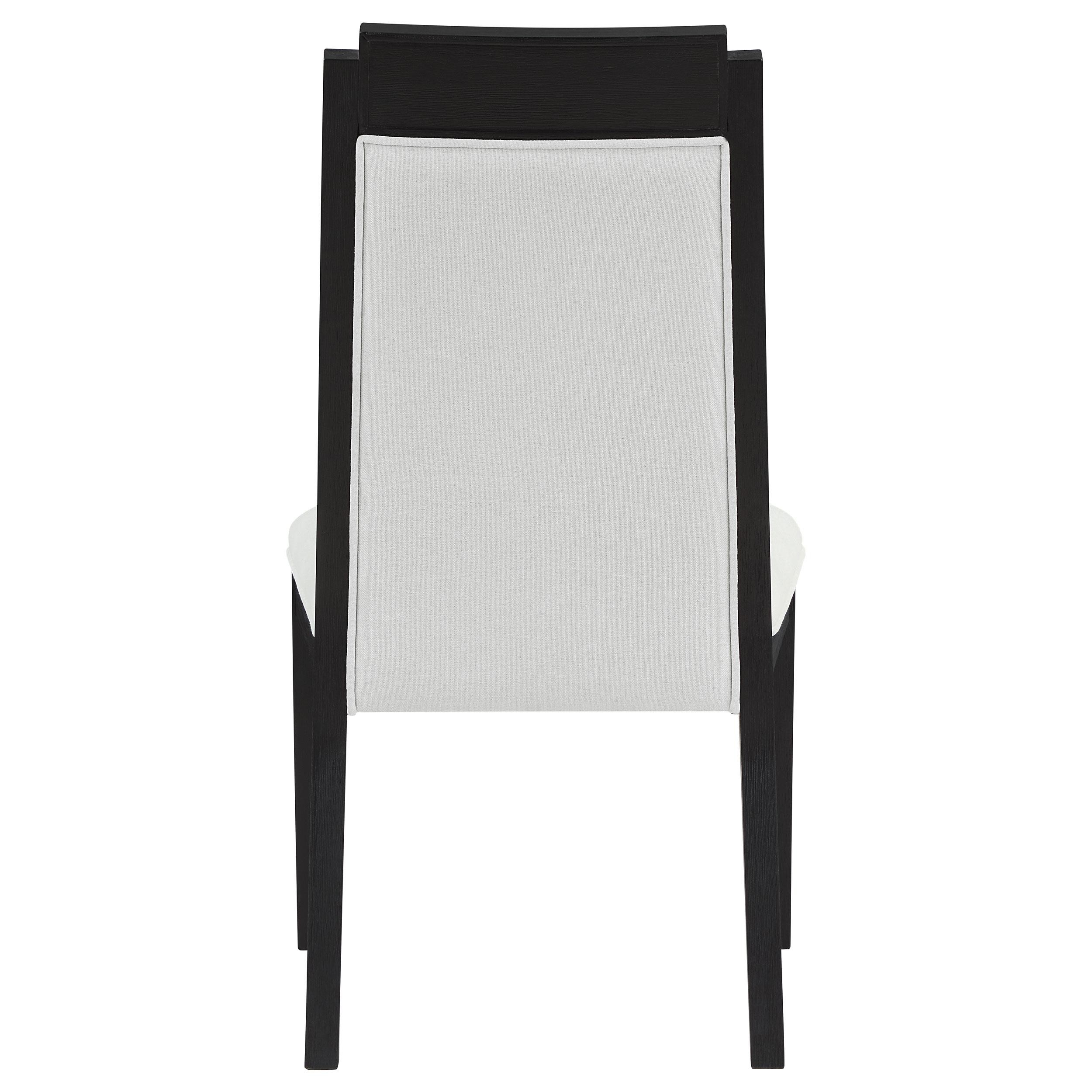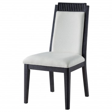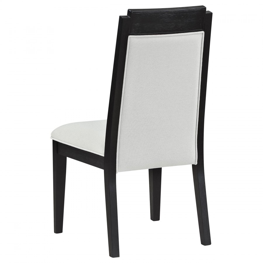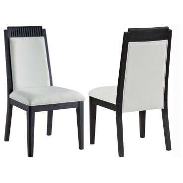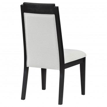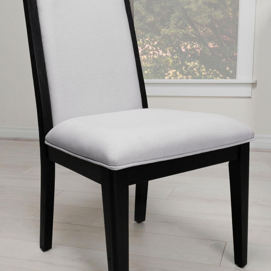 An energized style lifts the attitude in your living environment with a dining side chair adding a focal point. Your modern or transitional dining spaces transform with edgy color and finish contrasts in a chair set offering ultra-clean style and a bit of minimalism. Black finish rubberwood and wood products construction yields a bordered look to this chair design with soft ivory fabric upholstery on both sides of its backrest. A slightly angled side silhouette provides seating comfort and a silhouette boost. These chairs are topped with a geometric emblem featuring linear grooves, and notched edges that establish a crisp line.