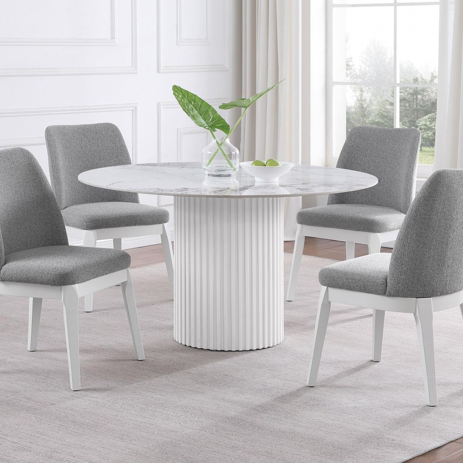 Instill a light, airy sensibility with a set of two modern dining chairs. Each side chair offers excellent comfort and support, complete with foam cushions and rubberwood framing. The set features a white finish over straight, splayed legs and an apron, creating a light, fresh base. The tall back and plush seat feature foam under soft upholstery in a neutral hue. Choose this pair of side chairs for kitchen or dining room and enjoy wonderful style and comfort.