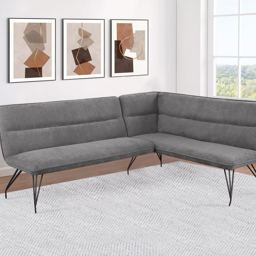 Maximize space and offer casual comfort with this mid-century inspired L-shaped dining bench. Perfectly designed to fit against a wall or in a corner, this banquette style seating is ideal for compact spaces like eat-in kitchens and apartments. The bench features a gentle pitched backrest and a fixed seat supported by hairpin legs, providing a relaxed and stylish sitting solution. Constructed with metal, fabric (100% polyester), rubberwood, foam, plywood, and webbing, the bench stands on hairpin style legs crafted in metal with a black finish, offering a crisp contrast to the neutral upholstery. The plush foam cushioning, covered in smooth fabric, along with a tufted back and pocket coil sinuous springs and webbing for cushion support, creates an inviting look and exceptional comfort.