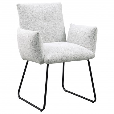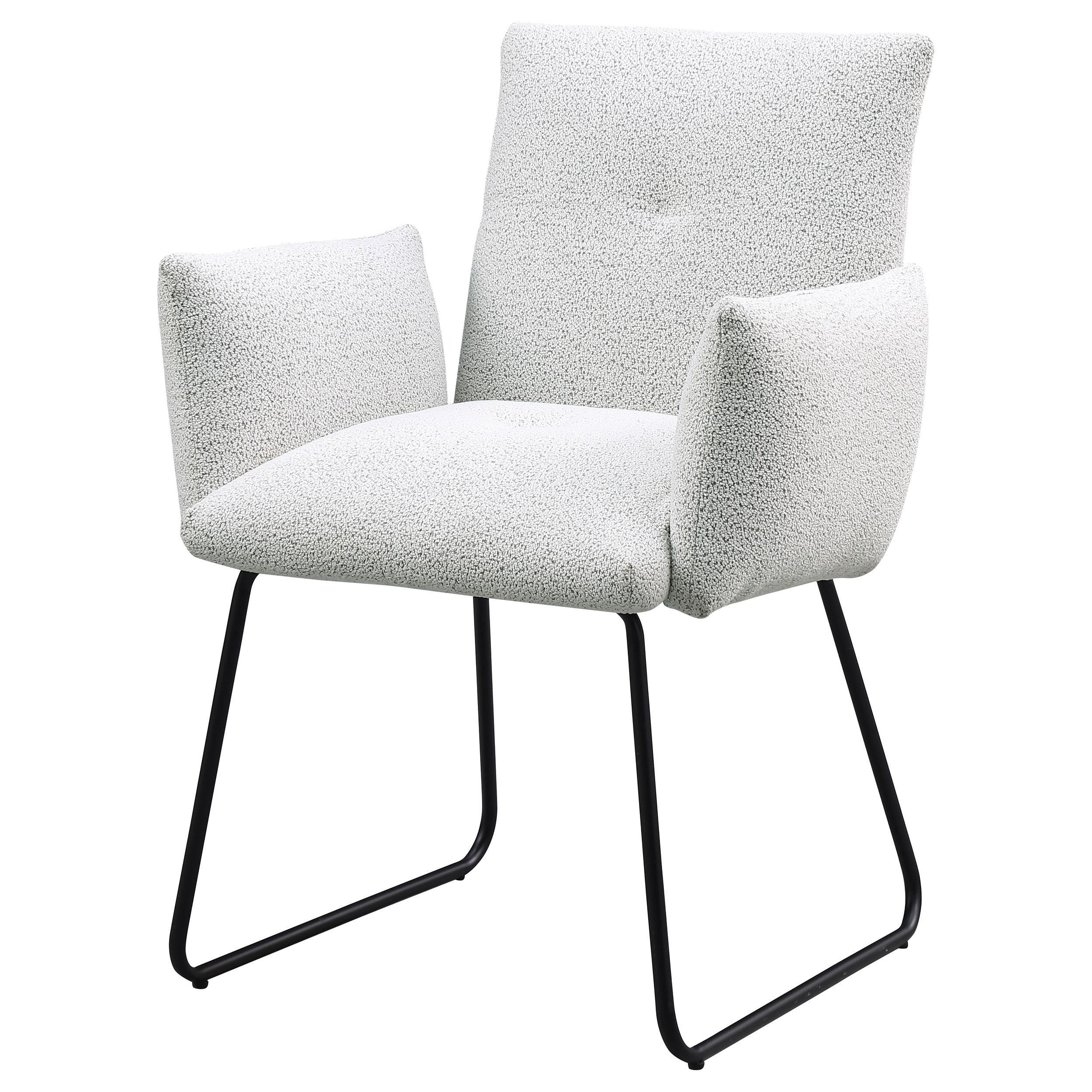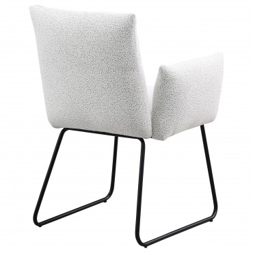Elevate your dining experience with this modern dining chair, designed for both comfort and style. Upholstered in soft fabric, this chair provides a cozy seat for everyday dining or special gatherings. The chair features a contemporary design with gently curved armrests and a sleek, powder-coated black metal sled base for a minimalist yet bold look. Its clean lines and subtle elegance make it a perfect addition to any modern dining room or kitchen space.