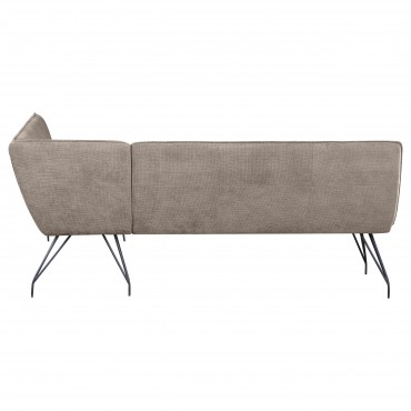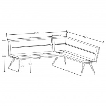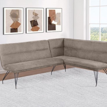 Maximize space and offer casual comfort with a modern L-shaped dining bench. Neutral upholstery covered plush foam cushioning, creating an inviting look and feel. Its corner design is ideal for compact spaces like eat-in kitchens and apartments, creating ample seating with a minimal profile. The bench stands on hairpin style legs crafted in metal with a black finish, offering crisp contrast to lighter upholstery. The bench features smooth seating and a tufted back, creating exceptional comfort.