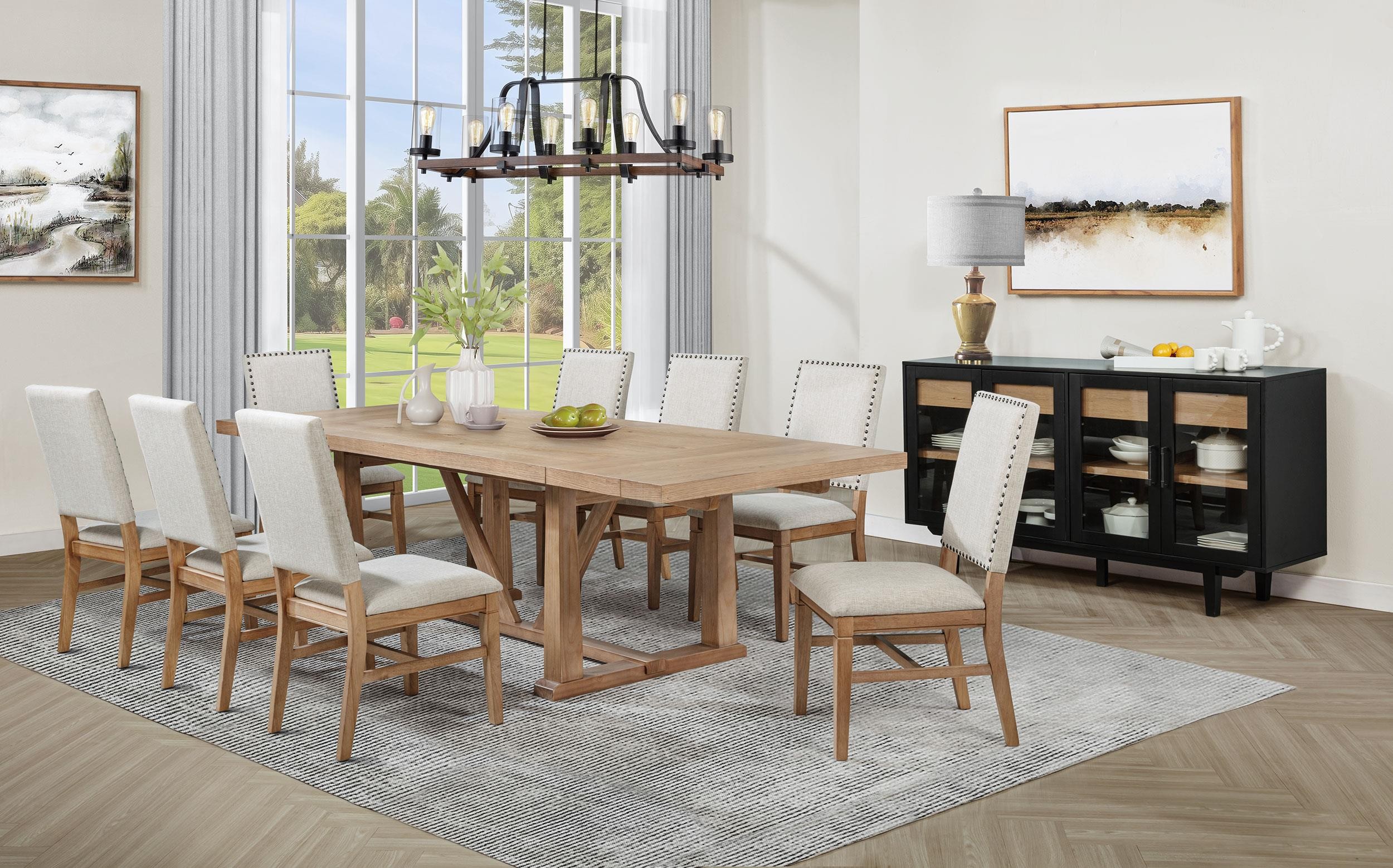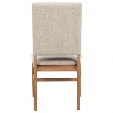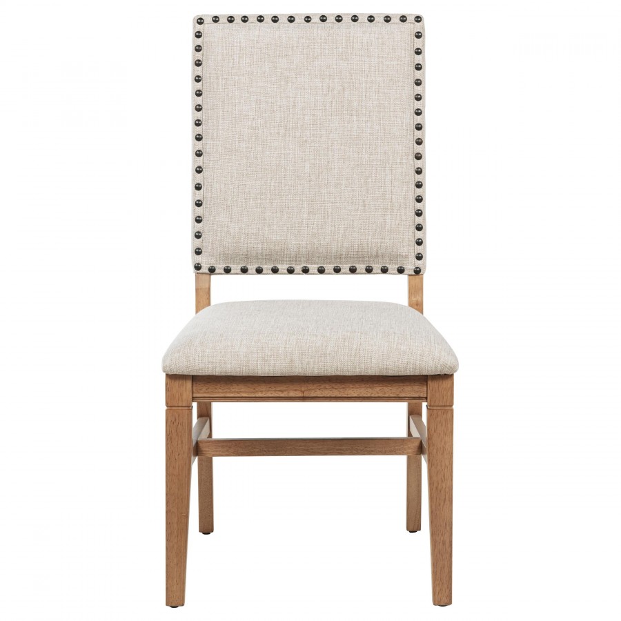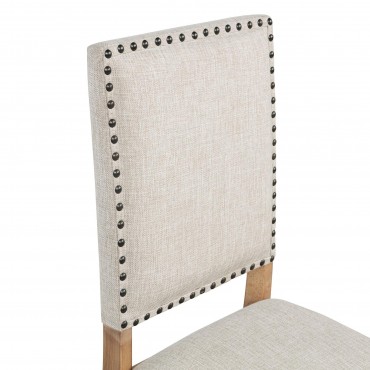 This refined dining side chair enhances any mealtime experience with subtle elegance. Upholstered in beige fabric, it features individually hand-driven dark bronze nailhead trim for artisanal detail. Crafted with a solid hardwood frame and legs in a natural brown finish, it combines style, stability, and comfort. Perfectly complementing a range of dining tables, this versatile chair creates a warm, inviting atmosphere.