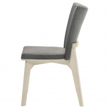 Enhance your dining area with the modern simplicity of this comfortable dining chair. The chair features soft gray fabric upholstery over plush cushioning for a comfortable seat. Its sleek, angular white base creates a subtle, airy contrast, while its streamlined design makes it a perfect match for contemporary spaces. Ideal for long meals or casual get-togethers, this chair adds both style and comfort to your dining set.