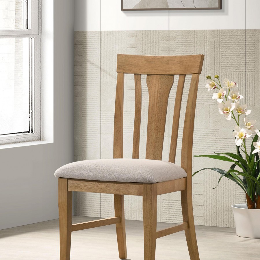 A fresh take on familiar tradition, this dining side chair pairs soft contours with classic craftsmanship. The sculpted slat back design adds character and support, while the padded light tan seat cushion provides lasting comfort. Framed in solid rubberwood with engineered wood accents and a light brown finish, this chair offers a relaxed yet polished look that fits effortlessly into casual or transitional dining spaces.