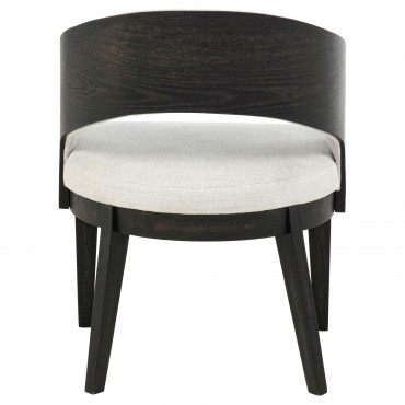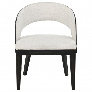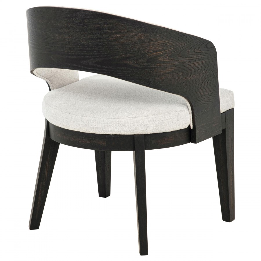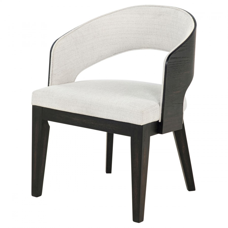 Every curve of this upholstered dining arm chair is a gesture of quiet sophistication. Its sculpted frame, finished in a deep burnished black, cradles a generously cushioned seat and softly wrapped backrest in creamy fabric. The open barrel design invites relaxed posture, while the smooth sweep of the arms lends an effortless sense of grace. Perfect for gathering, lingering, and savoring, this chair brings poetry to the table.