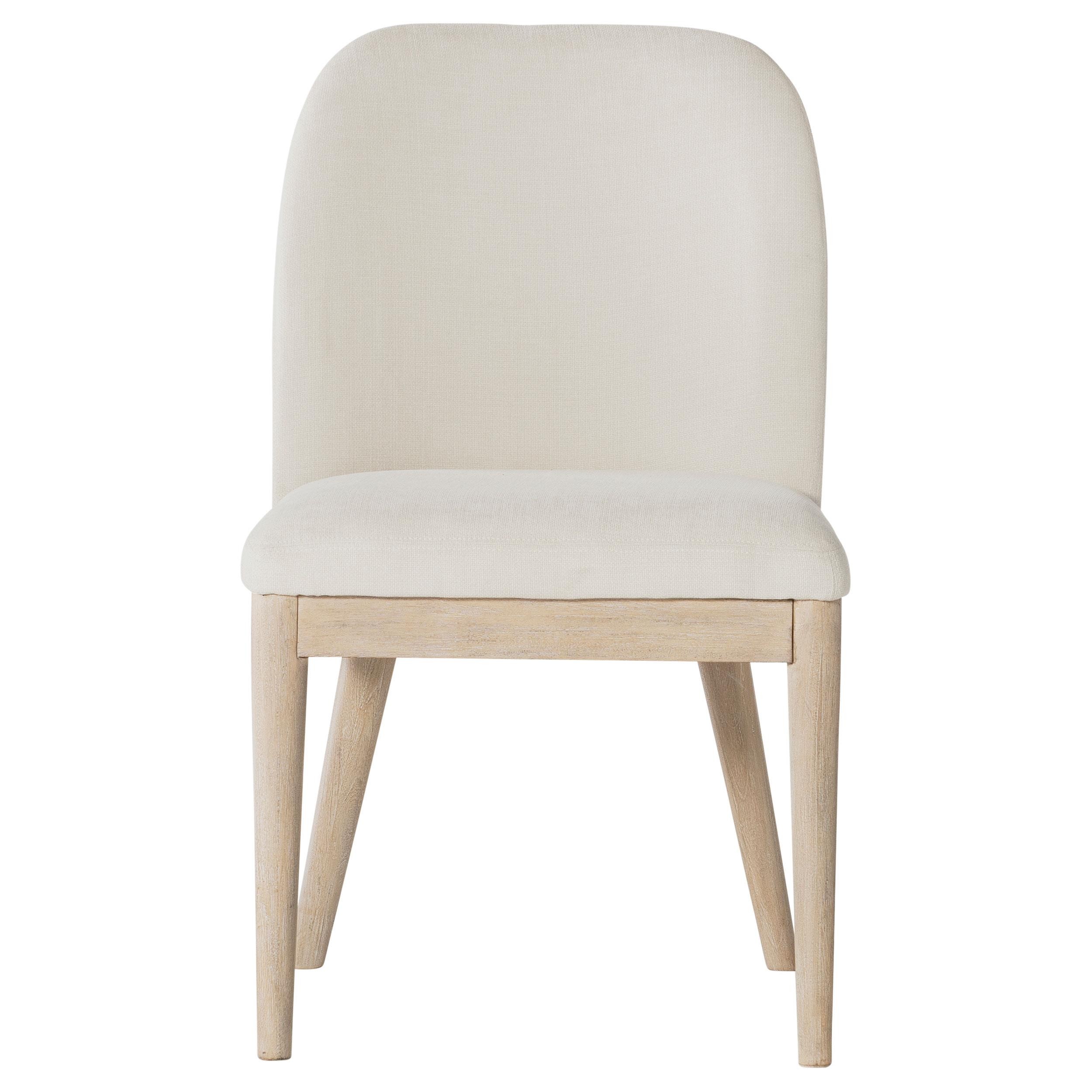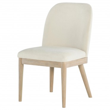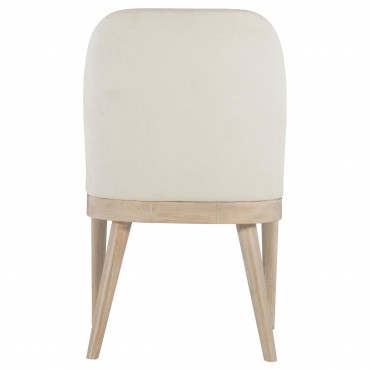 Softly contoured and effortlessly refined, this upholstered side chair brings comfort and poise to the dining room. A rounded back and tailored seat cradle the body in gentle support, while tapered legs add sculptural balance. Wrapped in beige fabric and finished in weathered mango, it pairs inviting texture with natural warmth. Crafted from mahogany, engineered wood, and foam, it offers lasting elegance for everyday meals or special gatherings.