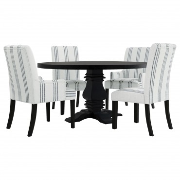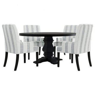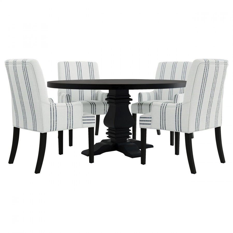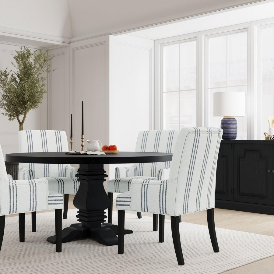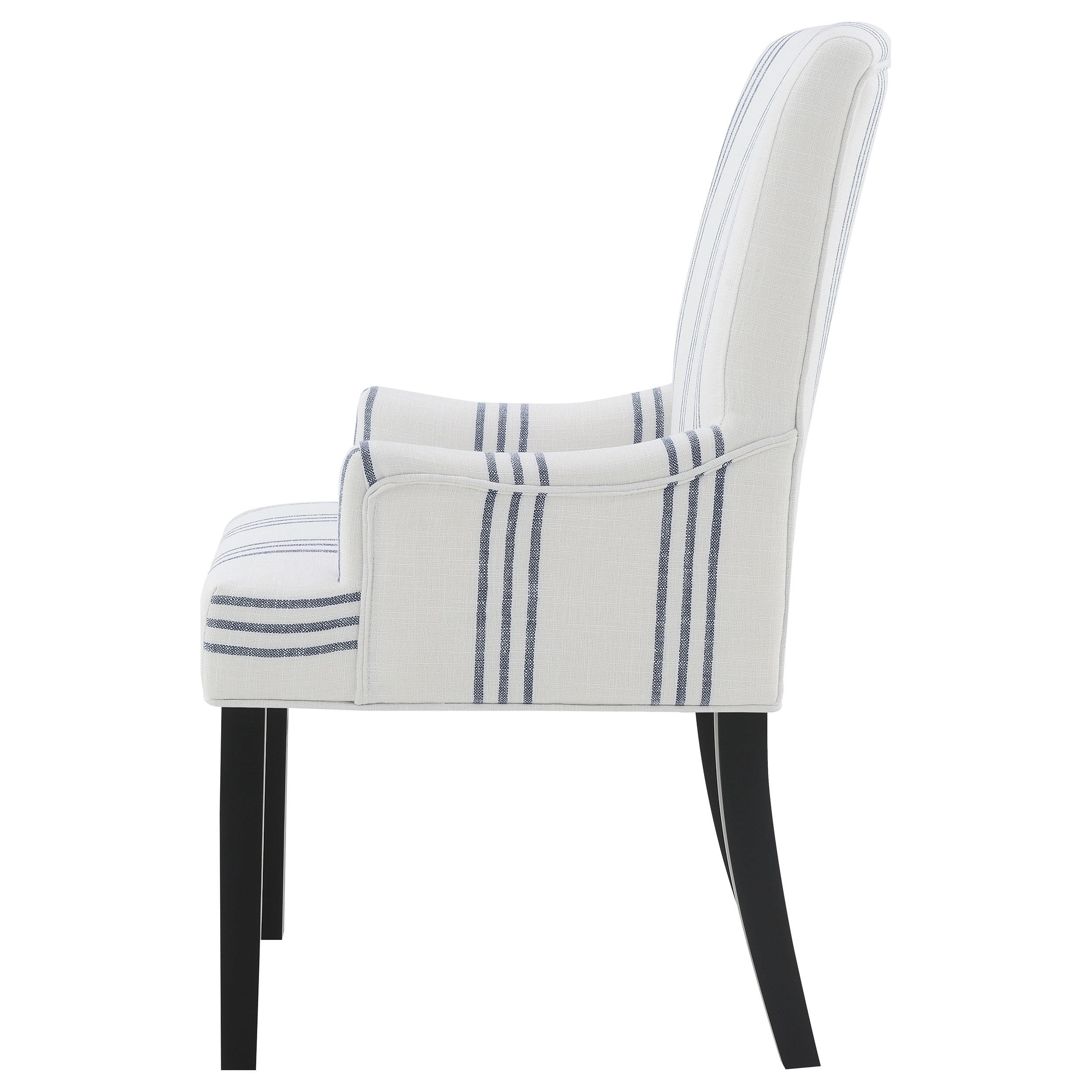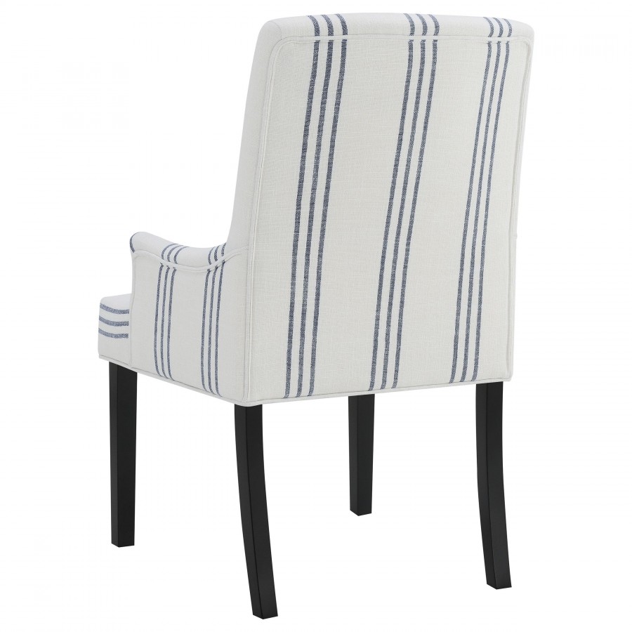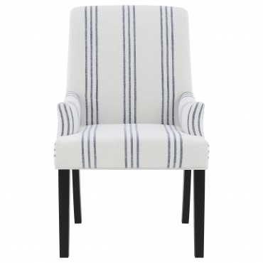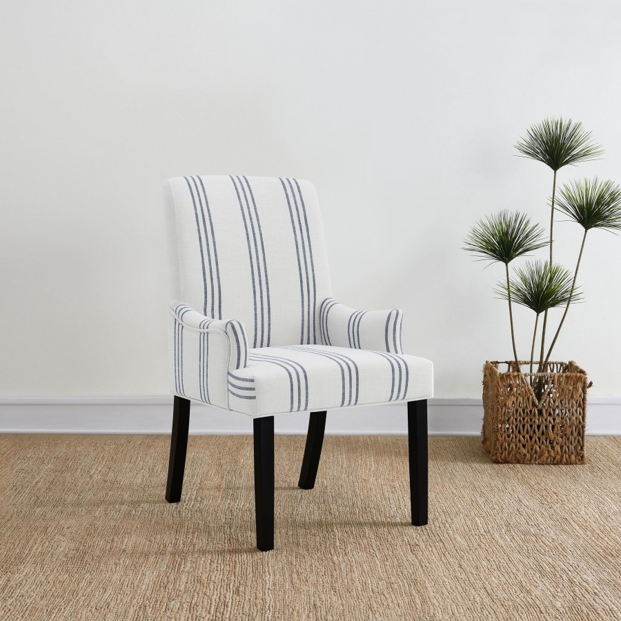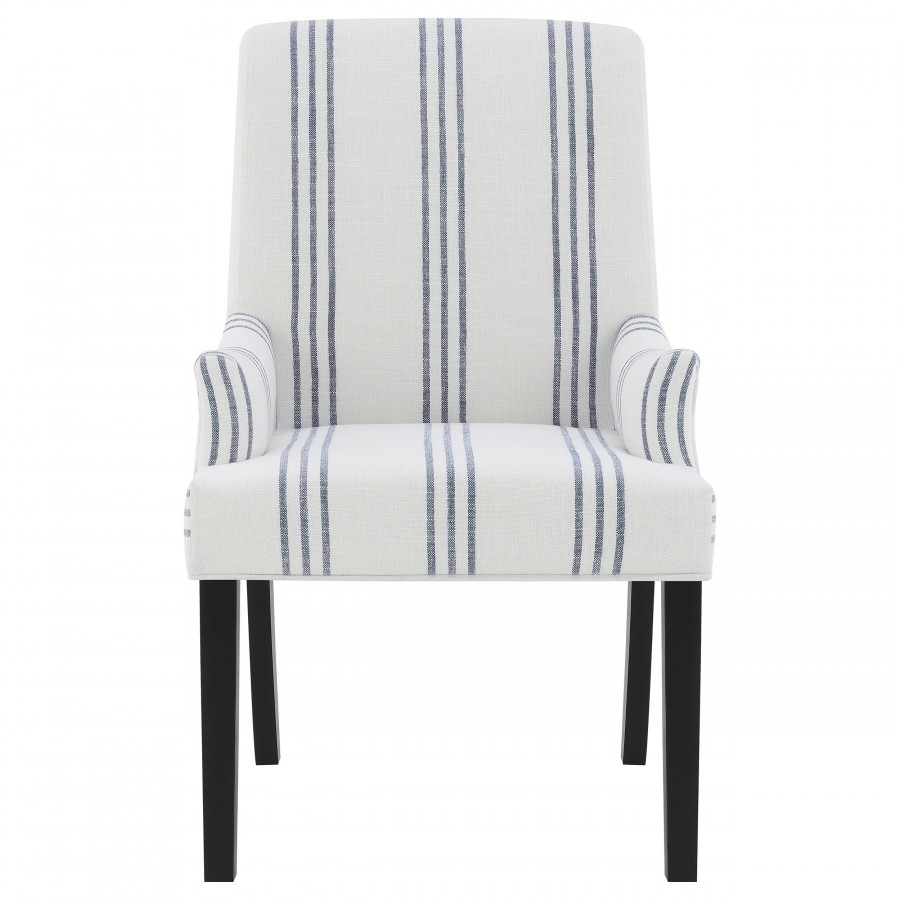 This armchair adds a refined yet relaxed charm to your dining space, blending comfort with casual elegance. Upholstered in linen-like beige fabric with blue stripes, it offers a timeless aesthetic. The padded seat, backrest, and gracefully curved arms ensure both comfort and style. Built with a sturdy rubberwood frame and a sleek black finish, this armchair provides lasting durability. Its versatile design works beautifully in transitional, modern, or farmhouse-inspired interiors.
