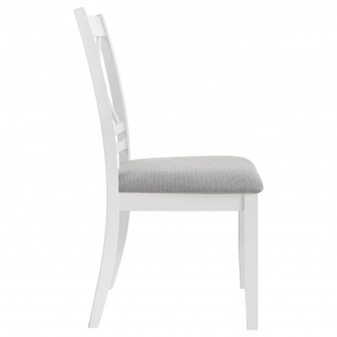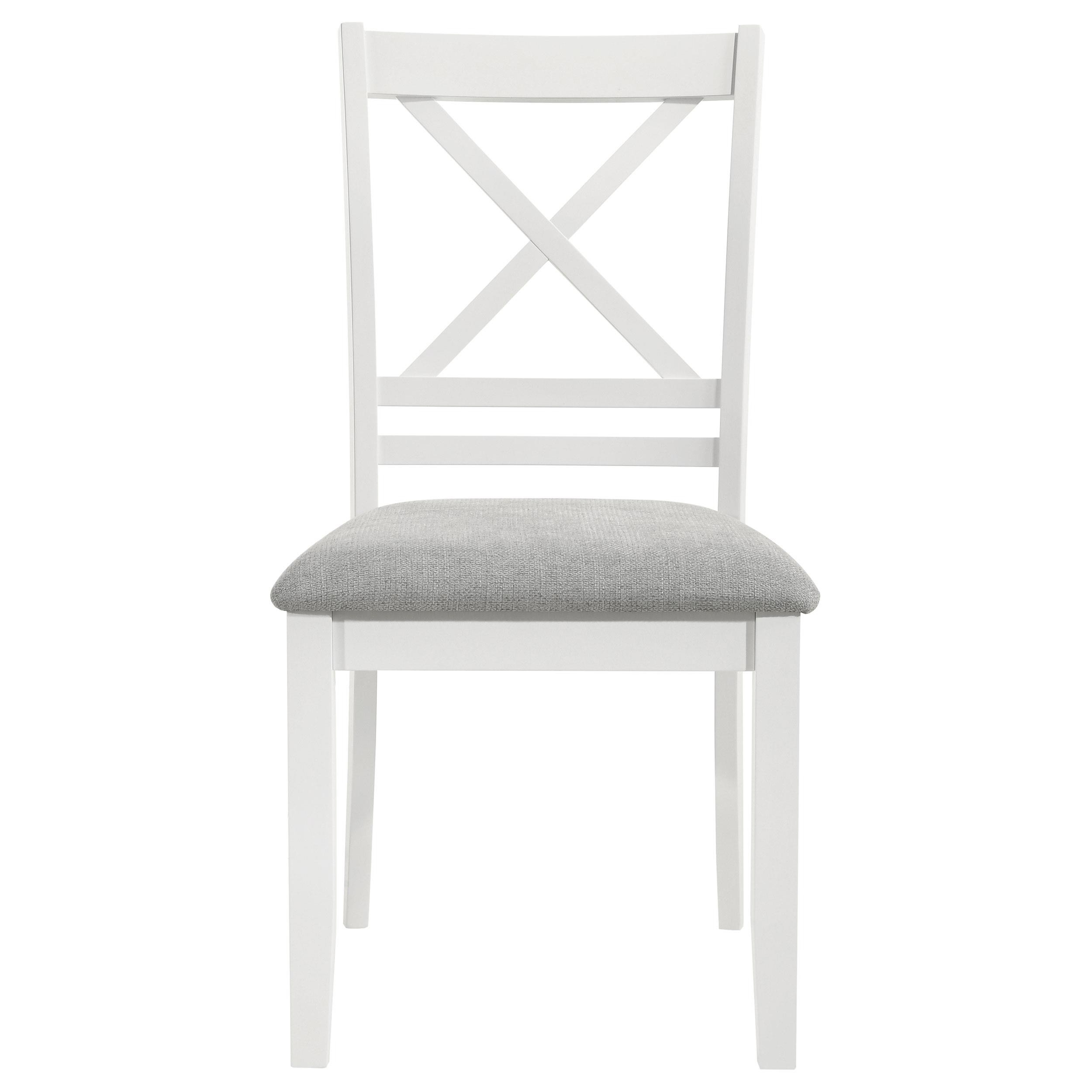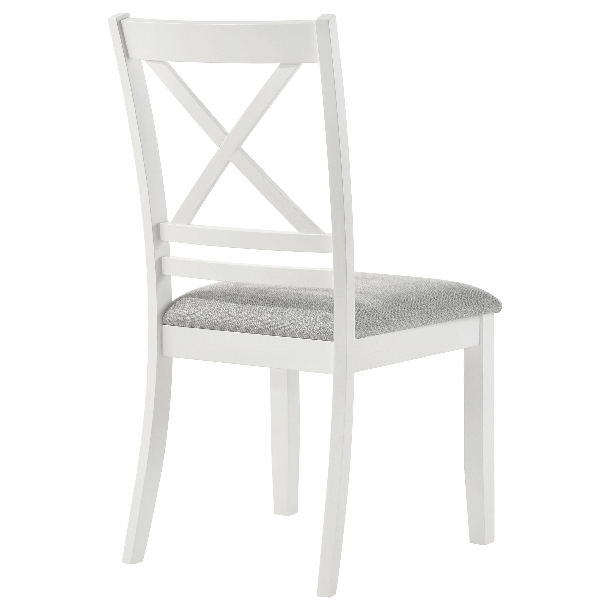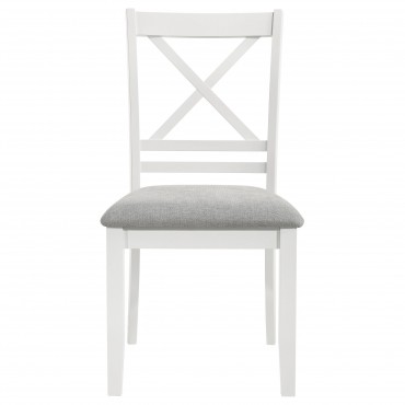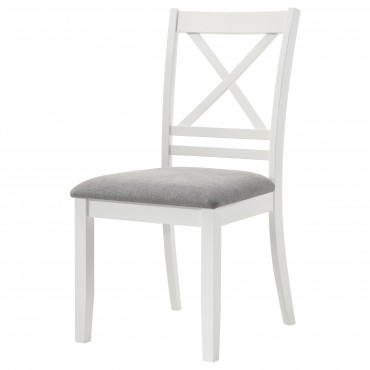 From its neutral palette to its charming details, this modern farmhouse side chair sets the tone in your kitchen or dining room. It shows off a classic stance, with sturdy construction that stands up to daily meals with the family. The chair features a crisp white finish over clean lines, with a charming X-cross detail decorating the seat back. Soft light gray upholstery covers foam cushioning on the seat, offering utmost comfort. Casual and inviting, it's an ideal choice for a welcoming dining table to break bread with friends and family.