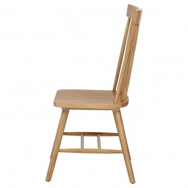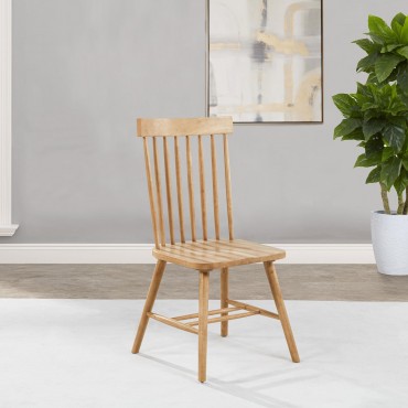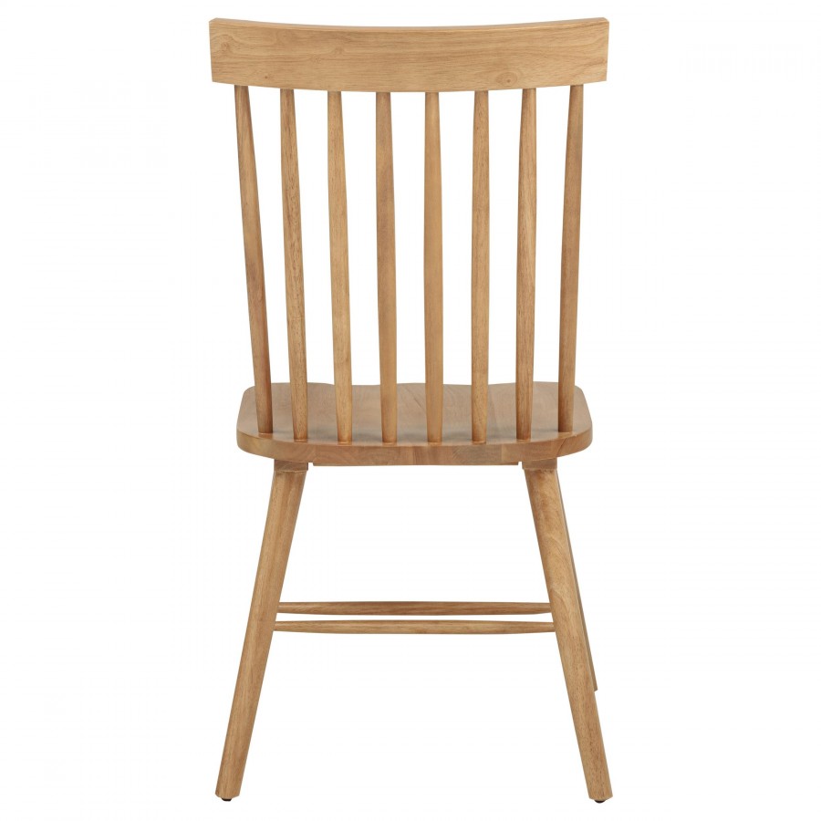 Classic and casual with a fresh farmhouse flair, this Windsor-style side chair features a high spindle back and gently contoured seat for timeless comfort. The clean silhouette is crafted from solid rubberwood with a rich wood veneer that enhances its natural grain. Angled legs with double stretchers offer reliable support and charm. Ideal for everyday dining, breakfast nooks, or cozy kitchen spaces.