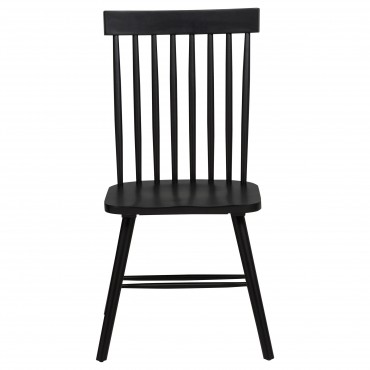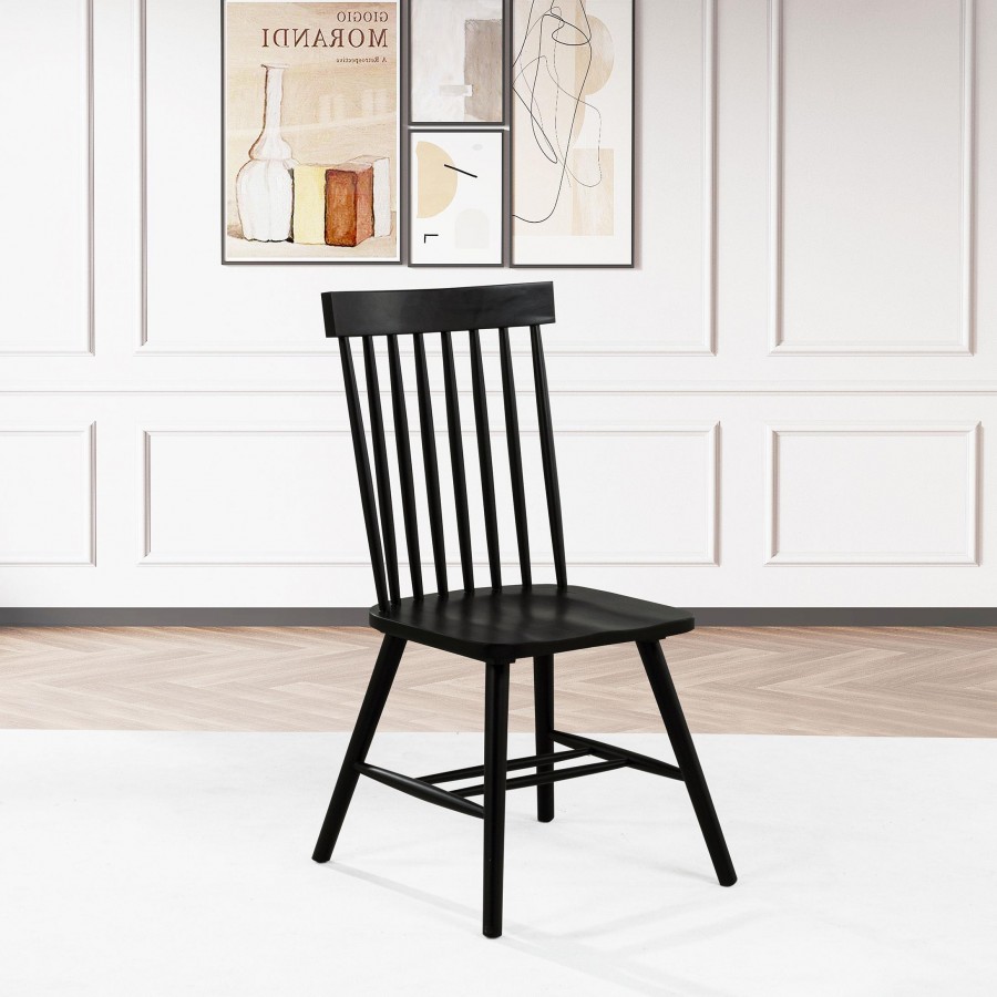 Classic and casual with a fresh farmhouse flair, this Windsor-style side chair features a high spindle back and gently contoured seat for timeless comfort. The clean silhouette is crafted from solid rubberwood with a rich wood veneer that enhances its natural grain. Angled legs with double stretchers offer reliable support and charm. Ideal for everyday dining, breakfast nooks, or cozy kitchen spaces.