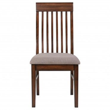 Punctuate a stylish dining table ensemble with a set of two modern side chairs. Each features a solid, stately silhouette with a mango oak wood finish that's dark and rich, perfect for friends and family alike. The chairs features tall, slatted backs, with gentle curvature that provides added comfort and support. Seats are padded with foam and upholstered in light brown fabric that's soft and neutral to complement in any setting. The chairs come in sets of two, perfect for creating a custom arrangement with the coordinating table or your existing dining table.