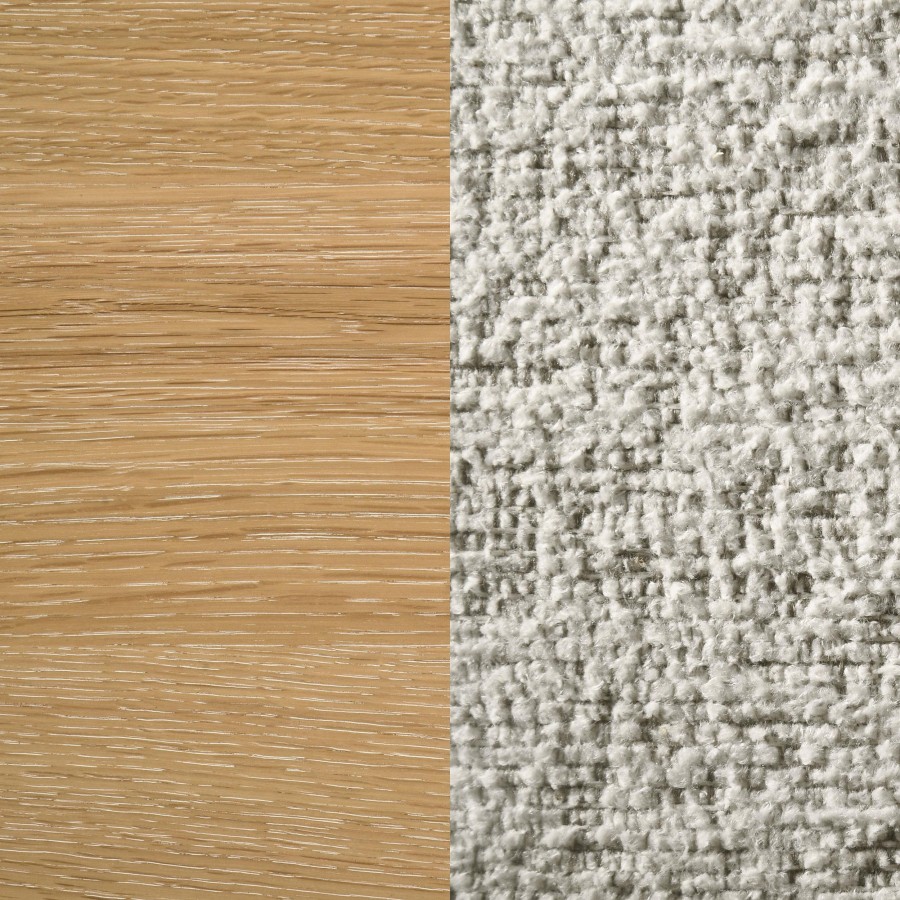 This ladder back dining side chair offers a relaxed blend of rustic character and contemporary ease. Crafted from solid wood in a washed oak finish, it features softly rounded posts and legs that bring warmth without ornate details. The cushioned seat is upholstered in a cozy oatmeal-colored bouclé fabric, providing both textural charm and everyday comfort. Built to support daily use, its clean silhouette and sturdy construction make it a versatile and enduring seating choice.