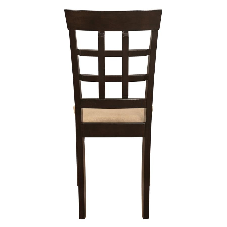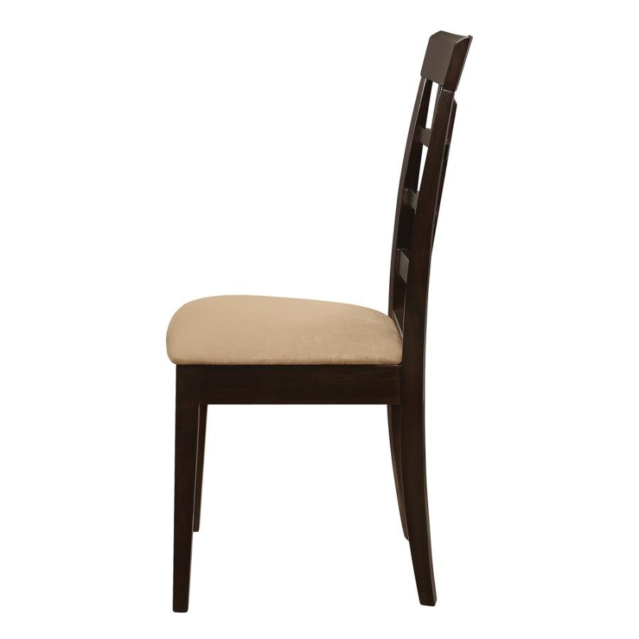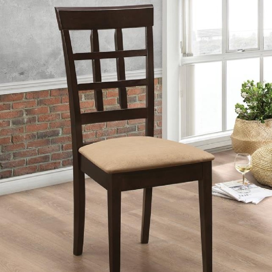 Pull this comfy chair up to your favorite table to relax and dine in style. Its plush, padded seat is covered in a soft, velvety fabric that's exquisitely pleasing to the touch. Its sturdy, supportive seat back adds an extra level of comfort. Blending deep shades of rich cappuccino with muted tones of beige, this chair gracefully complements various styles of decor. Its bold silhouette and checkered wooden design enhance any dining setup with charm, character, and class.