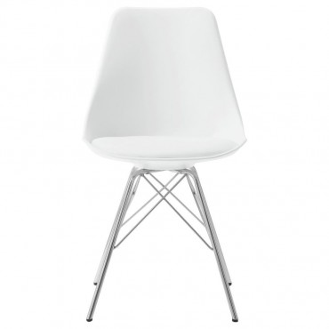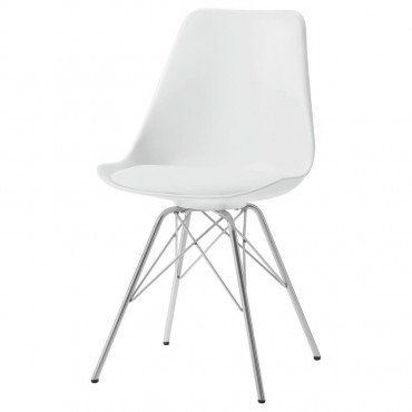 Designed with modern elegance in mind, this grey dining chair beautifully updates a contemporary home with its stylish silhouette and sleek materials. The seat and back are covered in smooth leatherette upholstery, adding a subtle textural appeal that pairs perfectly with the lightly cushioned seat for optimal comfort. The chrome-finished, metal base forms bold, angular designs, creating an eye-catching look that brings a fresh, modern vibe to any dining space. Perfect for casual meals or formal gatherings, this chair effortlessly enhances your dining room decor. Let this sophisticated piece breathe new life into your home with its chic and functional design.