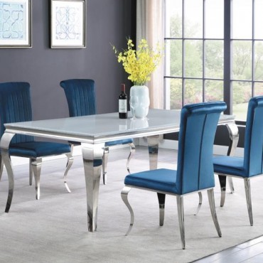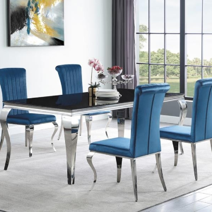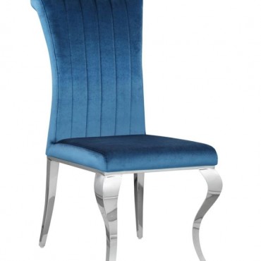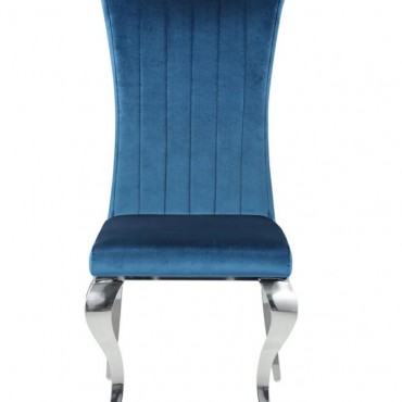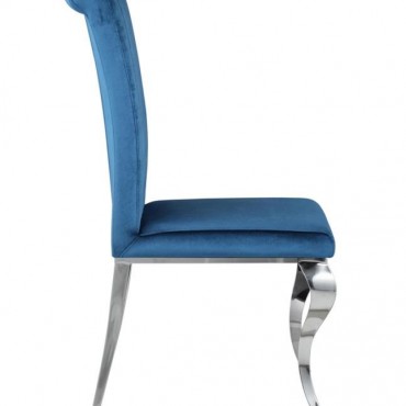 Elegant and ultra-glamorous, this upholstered dining chair offers a mixed material design that is made to last and perfect for formal dining rooms. Each chair features a stainless steel base and legs with a gleaming, shiny chrome finish. Cabriole-inspired curved legs in front add a traditional flair. Sit back and relax into channel tufted upholstery, complete with a tall backrest that rolls toward the top. Wrapped in a plush velvet fabric, these chairs are inviting and soft to the touch, and are offered in four different colors to accompany the Carone collection dining table.