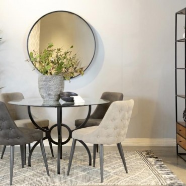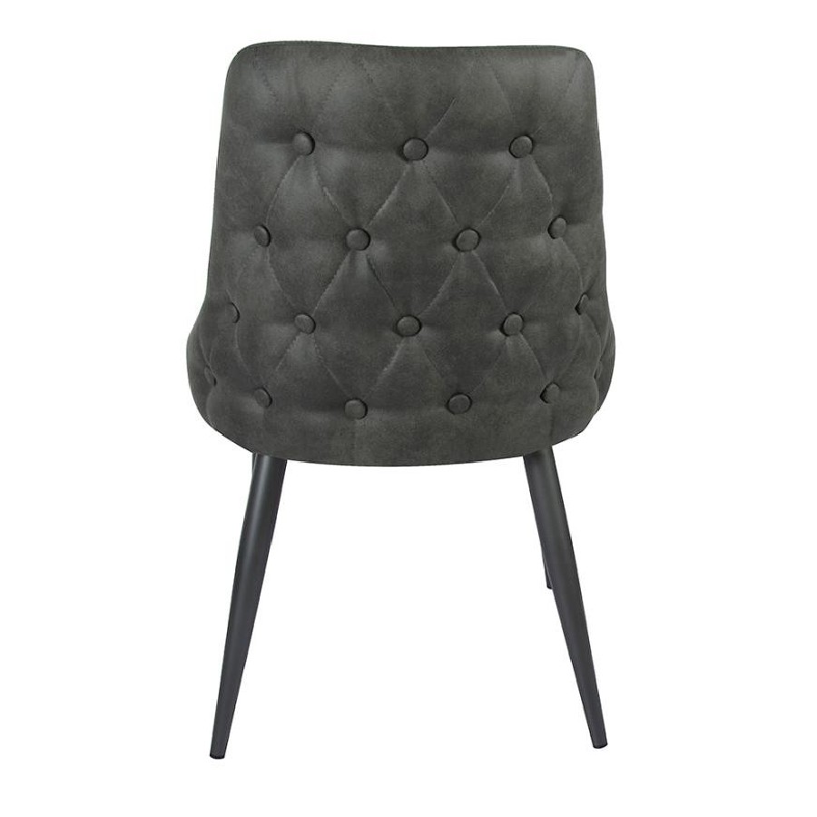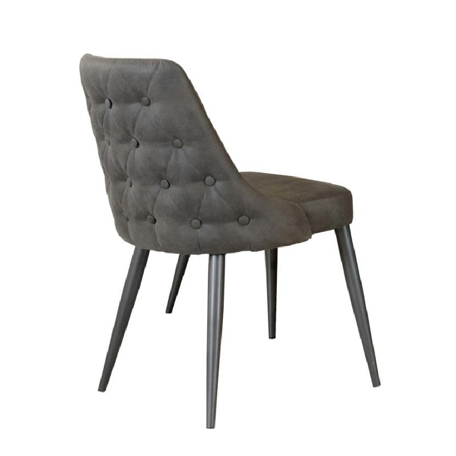 Blending mid-century inspiration with classic charm, this dining side chair is a stylish and versatile addition to any dining space. The gently curved backrest features elegant button tufting on the exterior and a smooth, cushioned interior for a refined look. A soft fabric upholstery provides a comfortable seating experience, while the slim tapered metal legs in a gunmetal powder-coated finish add a modern touch. Ideal for compact spaces, this chair offers both style and function.