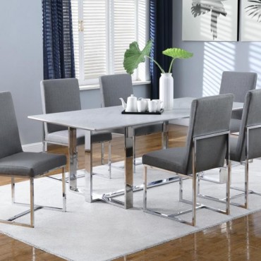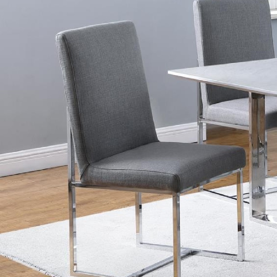 Elevate your dining space with this sleek and modern dining side chair, designed to blend style and comfort effortlessly. The chair features soft upholstery with a padded seat and backrest, providing a cozy seating experience for meals or gatherings. Its open metal frame, finished in polished chrome, creates a minimalist silhouette that adds a touch of contemporary elegance to any room. Perfect for both casual and formal dining settings, this chair complements a variety of decor styles, from modern to minimalist. Enhance your dining area with a chair that brings both visual appeal and functional design.