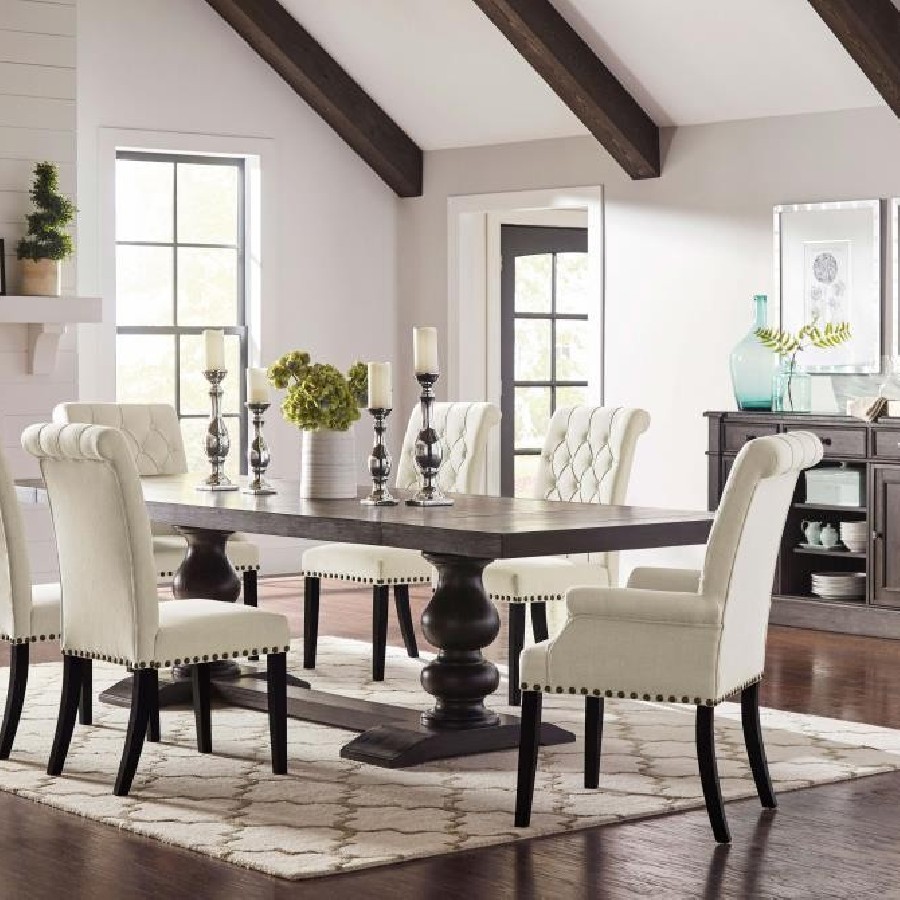 Blending timeless elegance with plush comfort, this side chair enhances any dining space. Its high backrest features a classic button-tufted design, adding depth and sophistication. A rolled top and hand-applied nailhead trim create refined detailing, while the generously padded seat ensures lasting comfort. Supported by sturdy, tapered legs, this chair is built for both beauty and durability. Whether part of a formal setting or an inviting everyday dining space, it brings grace and charm to the table.