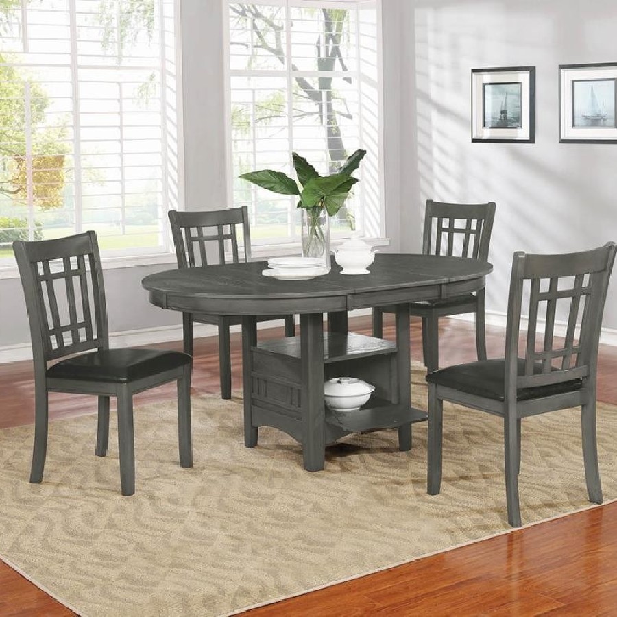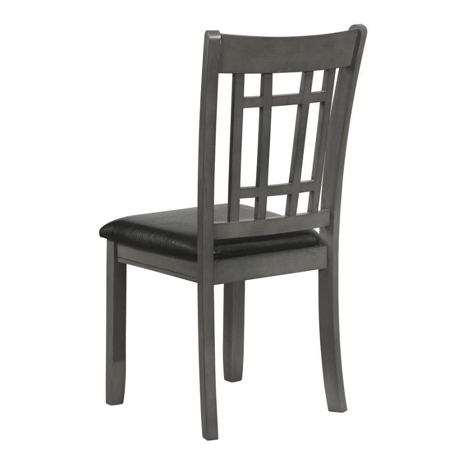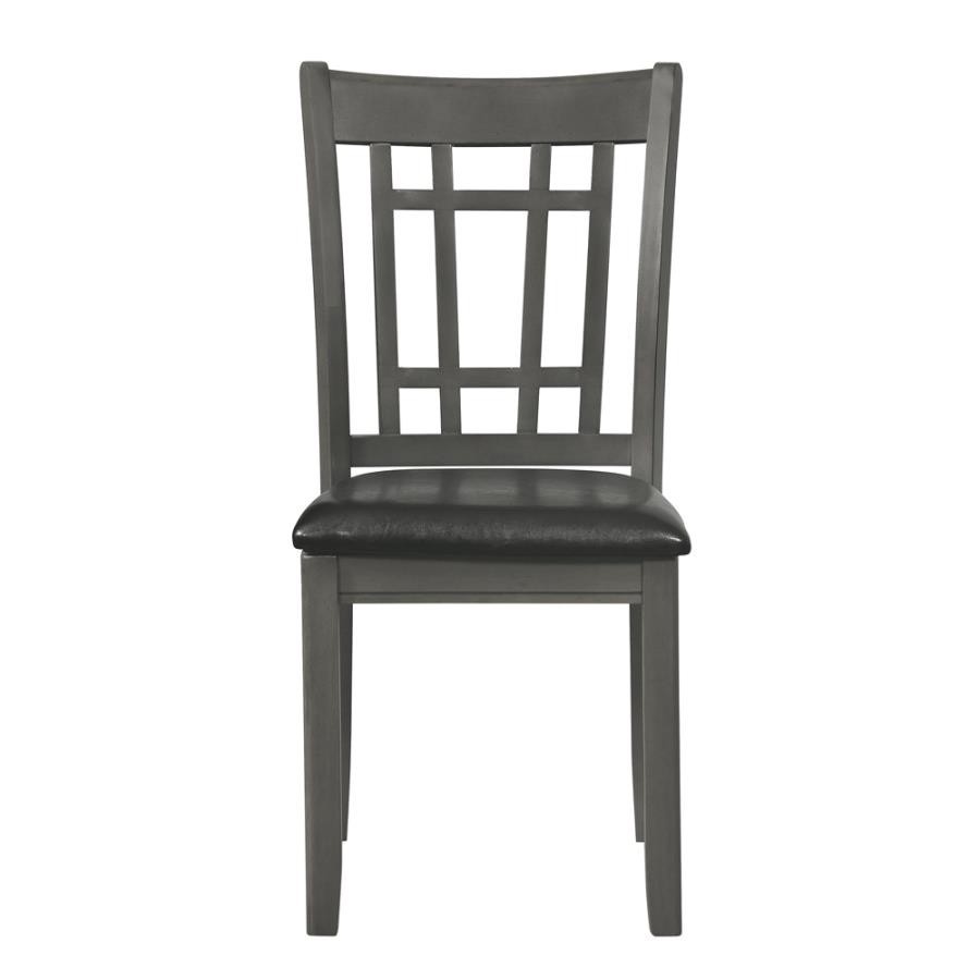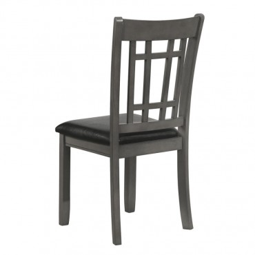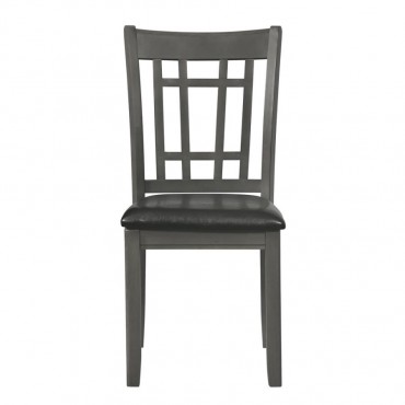 A combination of vertical and horizontal slats creates a window pane effect for this charming transitional dining chair. An armless silhouette is a versatile choice for relaxed, everyday living. The chair boasts a medium grey finish over rubberwood construction. Webbed seating and black faux leather upholstery combine for stylish comfort. Invite friends and family to have a seat and enjoy a lovely meal.
