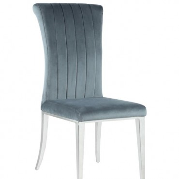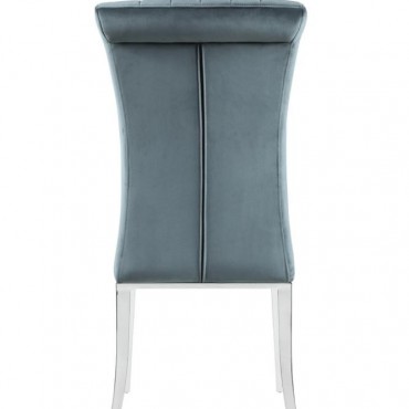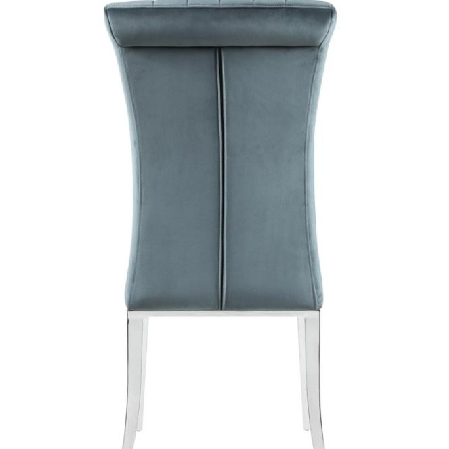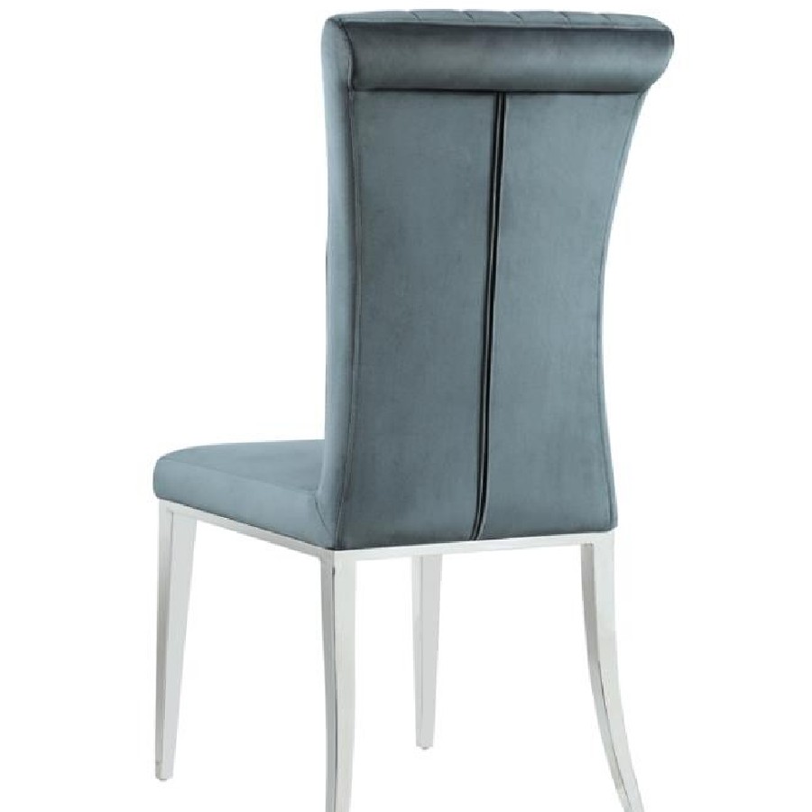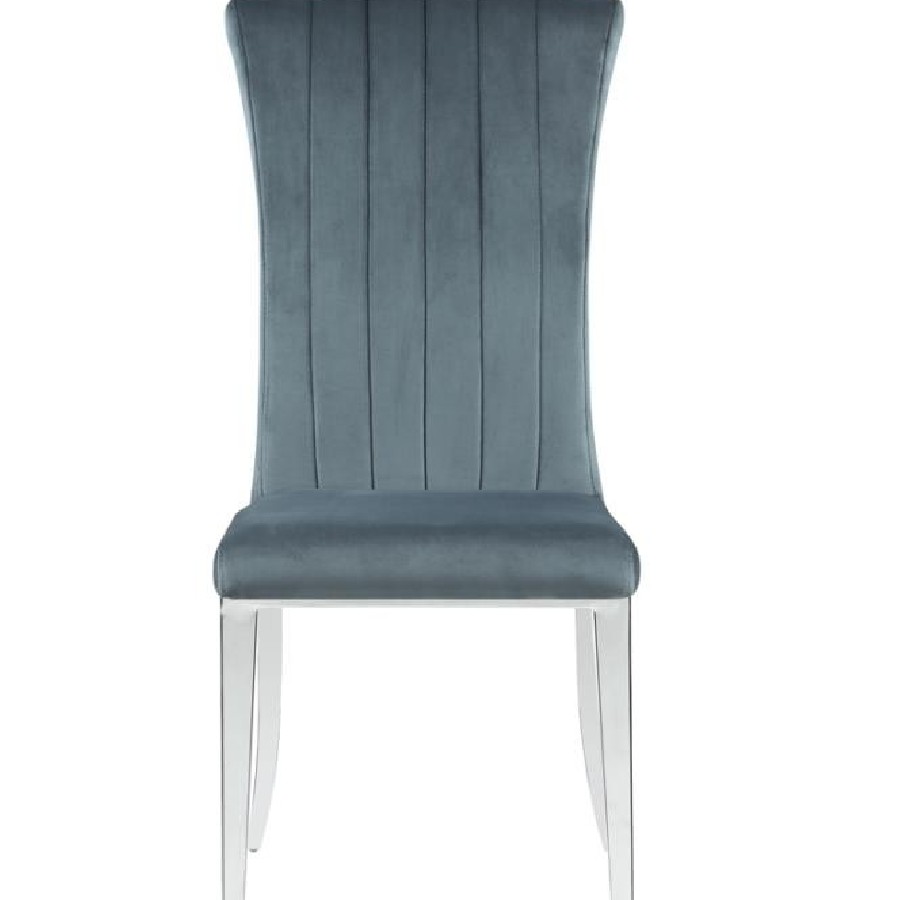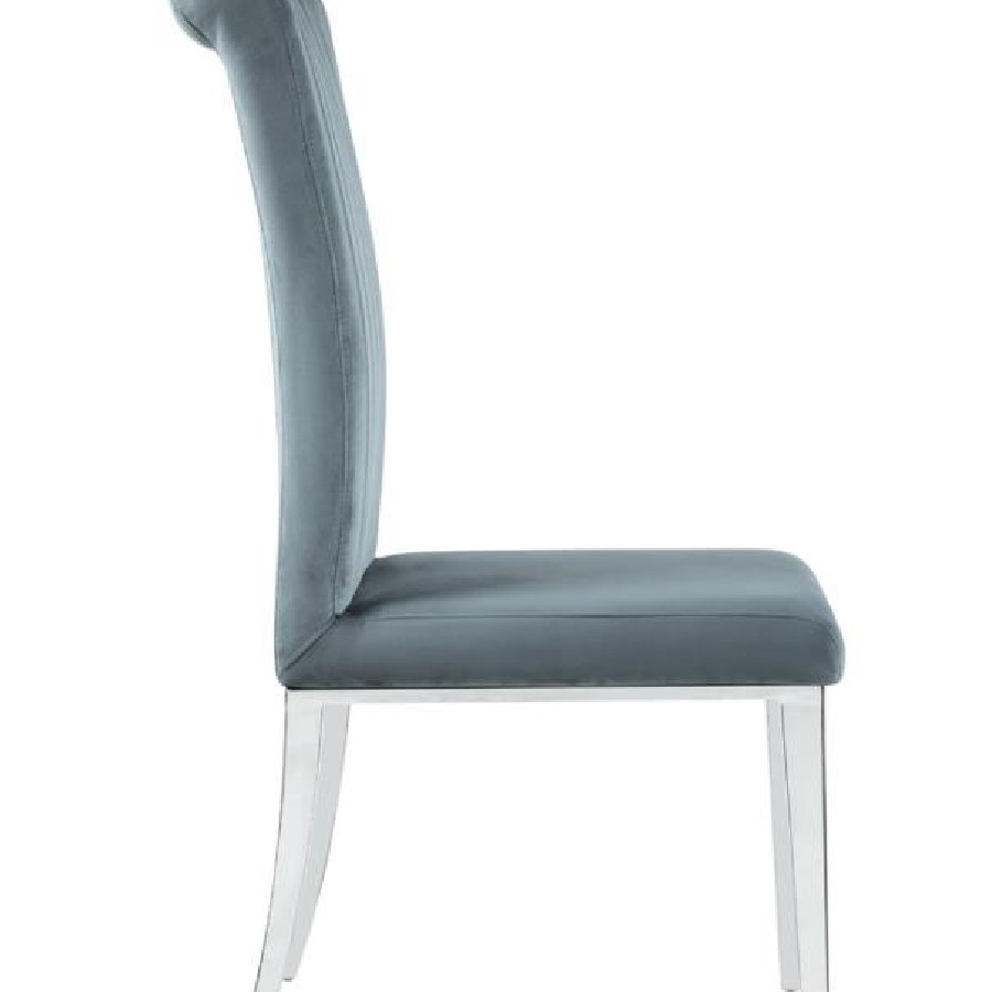 Elevate your dining experience with this refined side chair, upholstered in rich grey velvet for a luxe look and feel. The tall, gently rolled back adds graceful elegance, while vertical tufting brings tailored detail. Its cushioned seat offers comfort, and the polished stainless steel legs deliver a modern shine. Ideal for formal dining rooms, this chair strikes a perfect balance of sophistication and support.