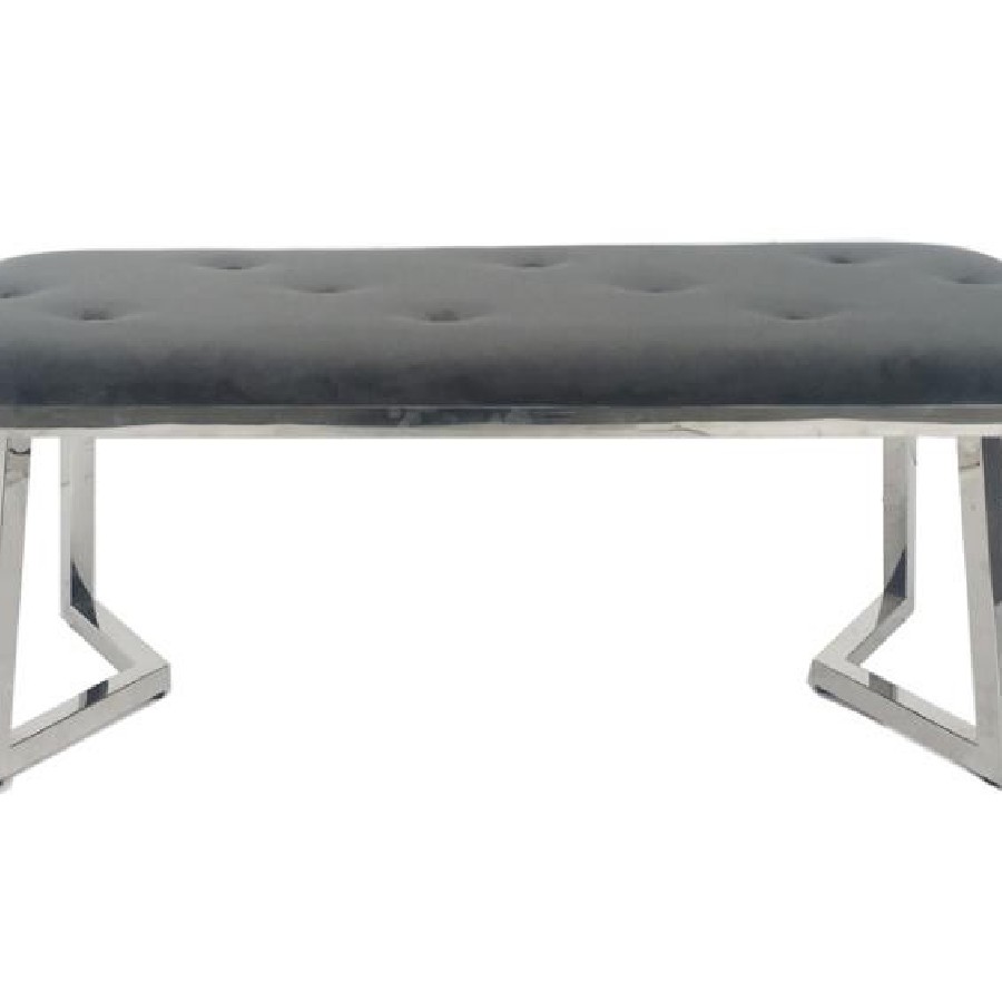 Add a sophisticated edge to your dining space with this contemporary velvet dining bench. Upholstered in plush grey velvet with button tufting, it offers a soft and inviting seat. The polished stainless steel base boasts a striking angular frame, delivering modern glam appeal. Ideal for extra seating at the dining table, this bench is both stylish and functional for upscale interiors.