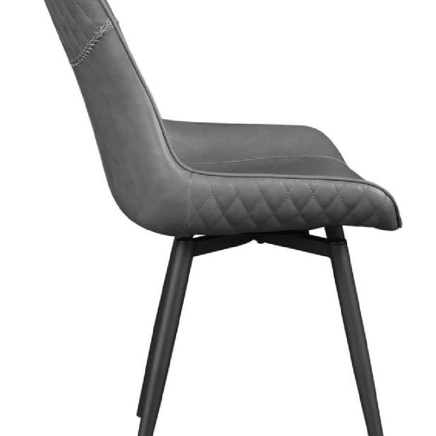 Bringing together mid-century modern elegance and contemporary comfort, this swivel dining chair is a stylish statement piece. Wrapped in soft grey fabric upholstery, its scooped seat and plush padding provide exceptional comfort. The quilted detailing on the backrest adds texture, while cross-stitched embellishments enhance its handcrafted appeal. Designed with a smooth swivel base, this chair rests on sleek, tapered metal legs, blending retro charm with modern versatility. A perfect fit for dining spaces, kitchen nooks, or stylish lounge areas.