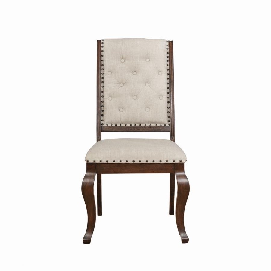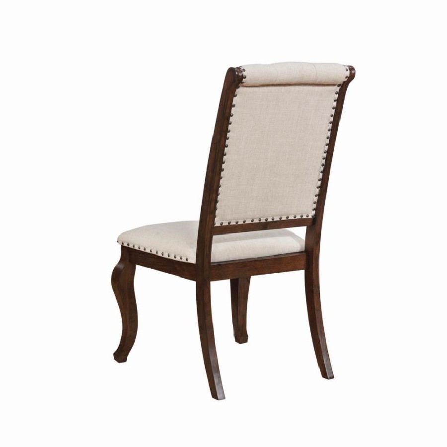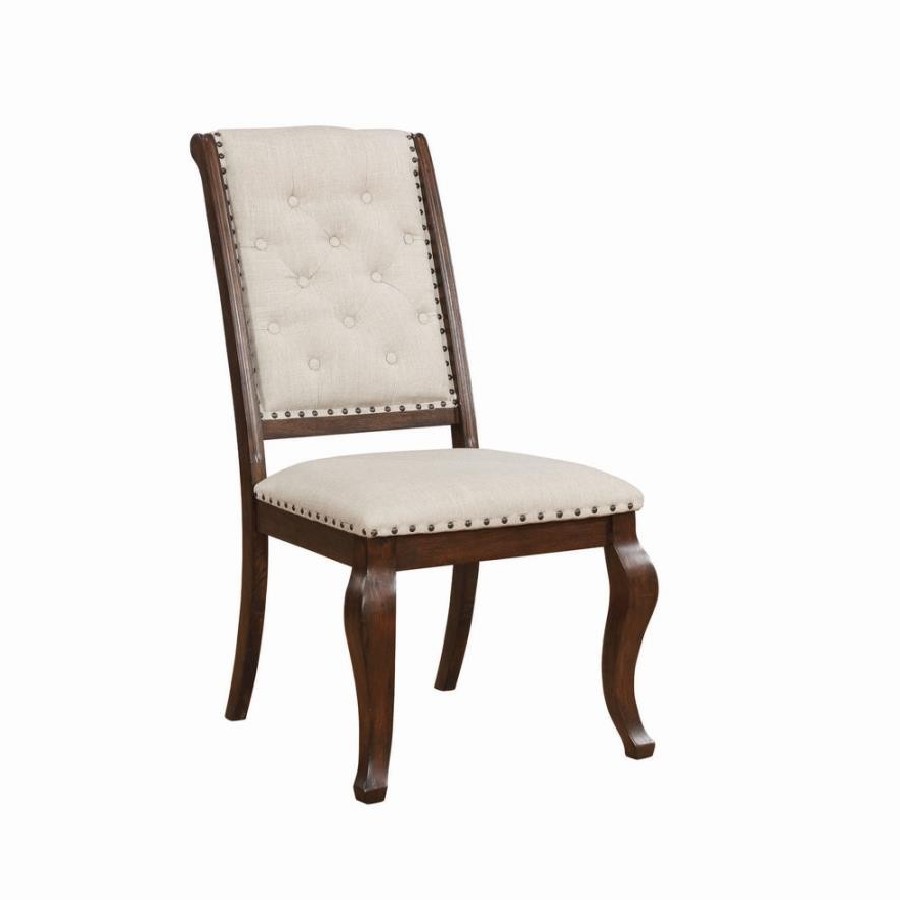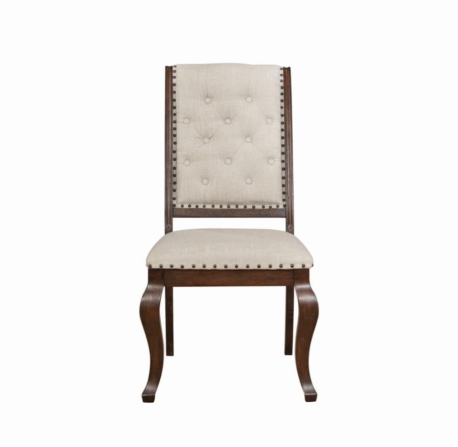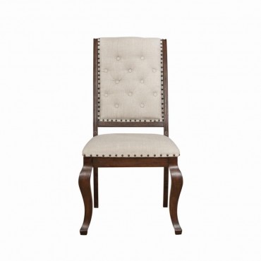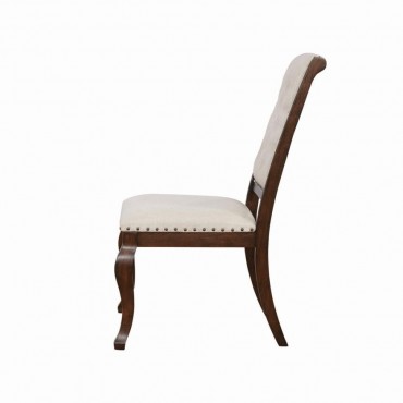 Antique java finish is a beautiful choice for this exceptional transitional dining side chair from the Brockway collection. Beautiful in any dining room, the chair offers a semi-formal, indulgent look with an upholstered, tufted back. Traced in nailhead trim, its seat is beautifully cushioned to deliver optimal comfort. Curvy front legs in an antique java finish catch the eye and contribute a touch of softness. A perfect complement to the Brockway dining table (sold separately).