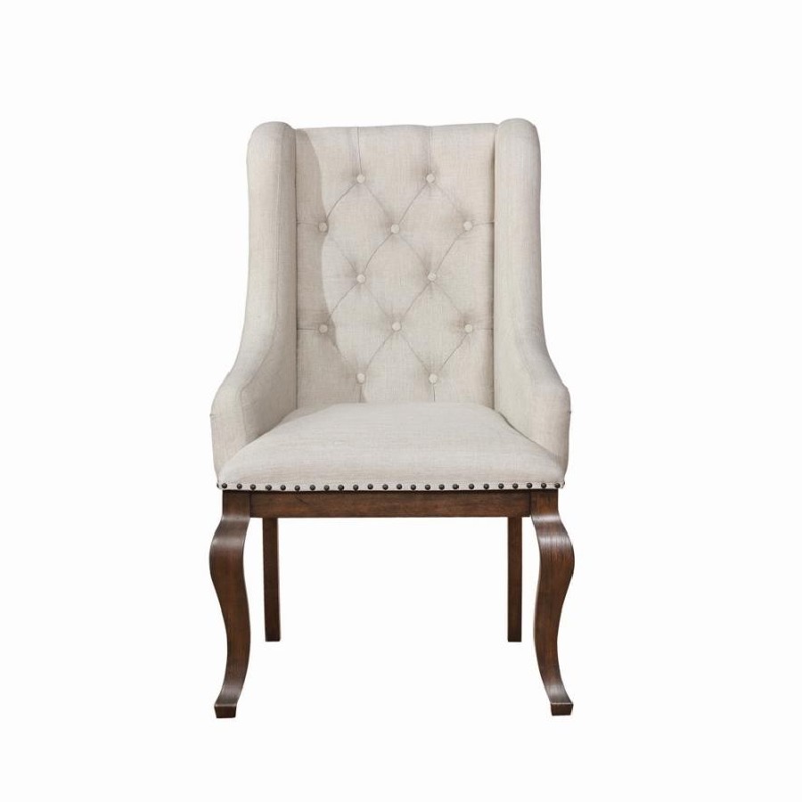 Go full-scale indulgent with this inviting dining arm chair. Beautifully upholstered in a neutral tone, the chair features sloping arms that draw the eye and offer superb comfort and support. Its button tufted back lends classic style. Nailhead trim creates definition while adding a touch of charming character. A transitional design, the armchair boasts a pair of curvy front legs in an antique java finish to perfectly accentuates the curves of the coordinating Brockway dining table (sold separately).