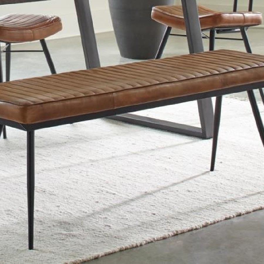 Blending rustic charm with industrial appeal, this dining bench is a bold yet versatile seating option. Upholstered in hand-dyed genuine goat leather, the padded seat with vertical tufting offers both comfort and durability. The sleek black metal base, featuring flared and tapered legs, provides a sturdy foundation with a modern edge. Designed to complement a variety of interiors, this bench is perfect for industrial, rustic, or contemporary dining spaces, offering both style and functionality.