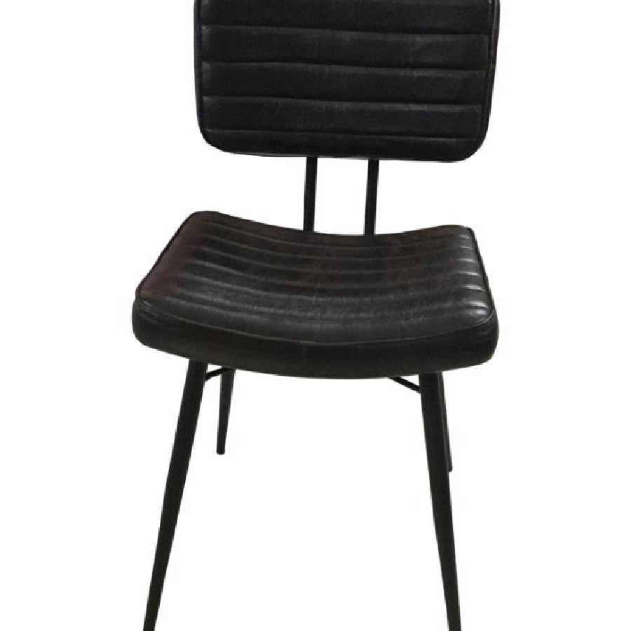 Blending industrial edge with vintage charm, this dining side chair is a striking addition to any dining space. Upholstered in hand-dyed genuine goat leather, the padded seat and backrest offer both comfort and durability. Vertical tufting details enhance texture and create a refined look, while the flared and tapered metal legs in a deep black finish provide sturdy support with a sleek contrast. Designed for long-lasting appeal, this chair brings a sophisticated yet rugged aesthetic to modern, industrial, or rustic interiors.