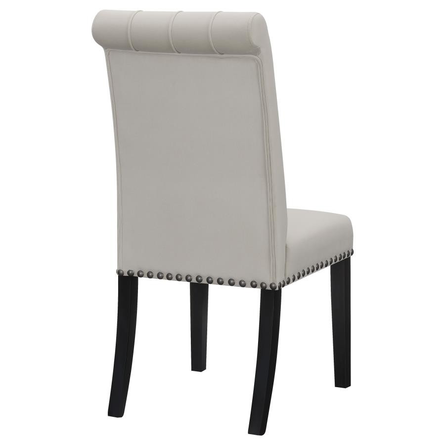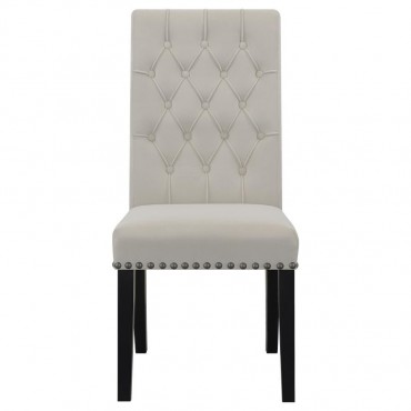 Blending timeless elegance with plush comfort, this side chair enhances any dining space. Its high backrest features a classic button-tufted design, adding depth and sophistication. A rolled top and hand-applied nailhead trim create refined detailing, while the generously padded seat ensures lasting comfort. Supported by sturdy, tapered legs, this chair is built for both beauty and durability. Whether part of a formal setting or an inviting everyday dining space, it brings grace and charm to the table.