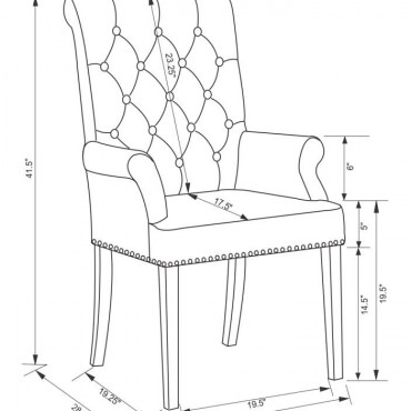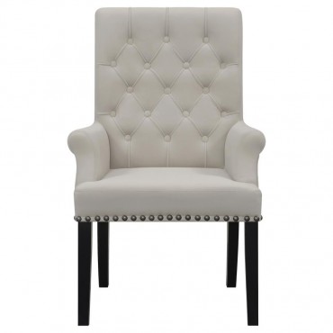 Designed for both luxury and support, this arm chair brings an elegant presence to any dining space. Its button-tufted high back and rolled top lend a timeless aesthetic, while the addition of padded armrests enhances comfort. Hand-applied nailhead trim offers a sophisticated finishing touch, complementing the chair’s tailored silhouette. A generously padded seat and sturdy legs ensure both durability and long-lasting comfort, making it a stunning choice for formal and everyday dining alike.