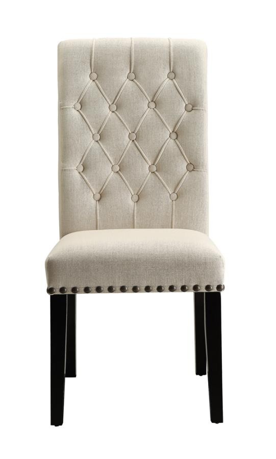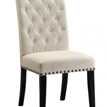 Blending timeless elegance with plush comfort, this side chair enhances any dining space. Its high backrest features a classic button-tufted design, adding depth and sophistication. A rolled top and hand-applied nailhead trim create refined detailing, while the generously padded seat ensures lasting comfort. Supported by sturdy, tapered legs, this chair is built for both beauty and durability. Whether part of a formal setting or an inviting everyday dining space, it brings grace and charm to the table.