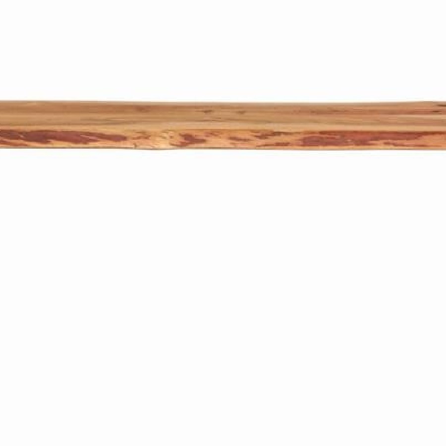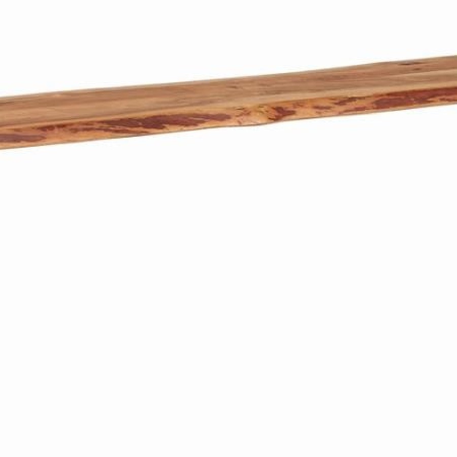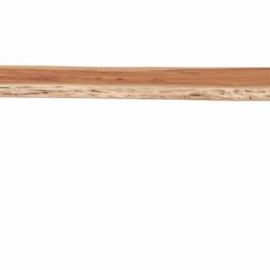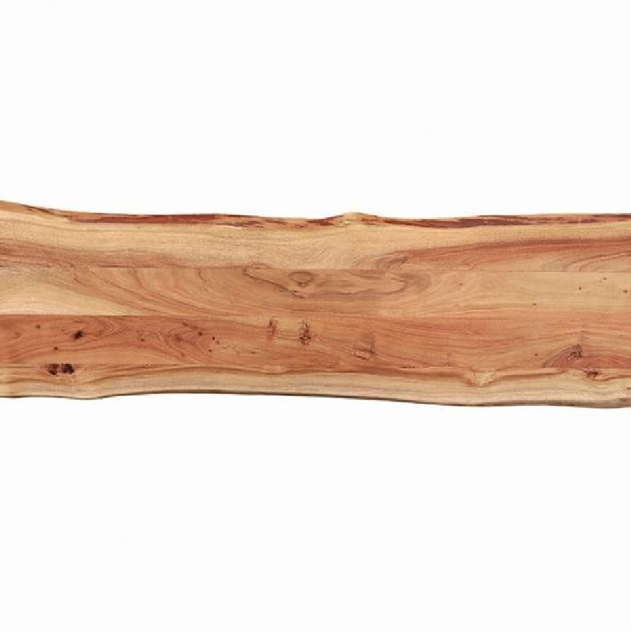 The perfect marriage of rustic charm and industrial design, this rectangular dining bench makes a modern statement. Designed with natural acacia, the bench top features an exposed wood grain with slight distressing. Contrasting against this warmth is the dark tone from the gunmetal finish of the legs. Four open hairpins, created with thin metal, support the rustic top. Add coziness to a sleek and contemporary motif with the charming hues and materials.