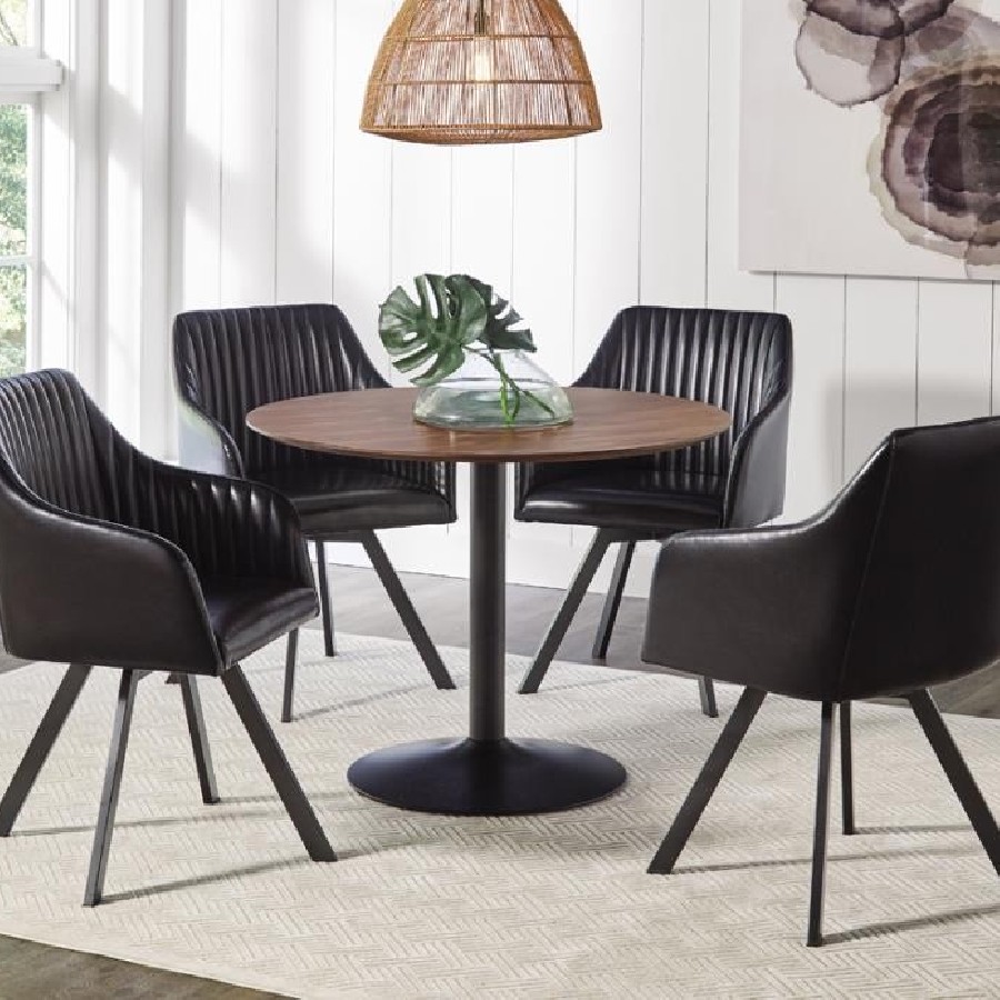 Blending mid-century flair with modern versatility, this swivel dining armchair adds a refined touch to any dining space. Upholstered in black faux leather, the bucket-style seat with sloped arms provides a sleek, vintage-inspired aesthetic. The vertical channel tufting enhances texture, while the swivel base ensures effortless movement. Supported by flared metal legs in a gunmetal powder-coated finish, this chair delivers both style and stability, making it perfect for dining tables, card tables, or stylish accent seating.