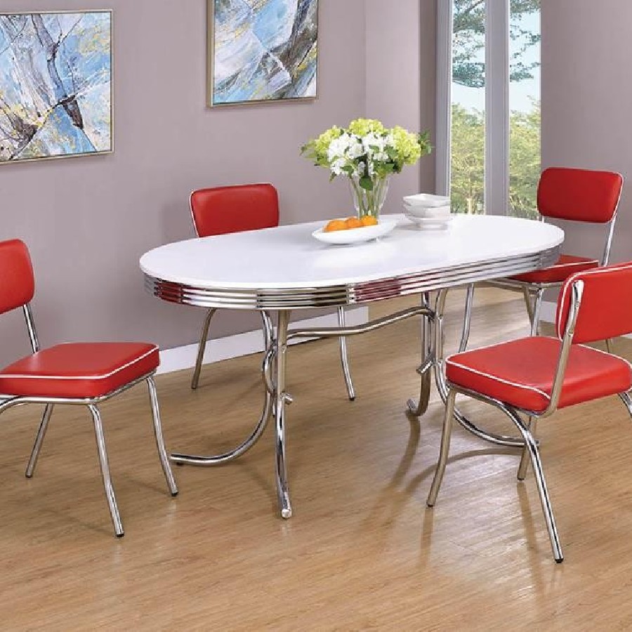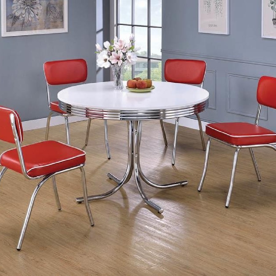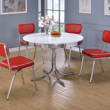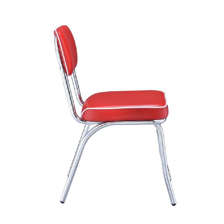 Complement a retro dining table and other decor with this chrome plated chair. Seat frame and legs gleam in chrome plating. Legs angle slightly out and seat gently reclines for a casual silhouette. Seat back and thick cushion are wrapped in luscious red with white piping. Tip: the red perfectly disguises an ace of hearts when you need a trump card.