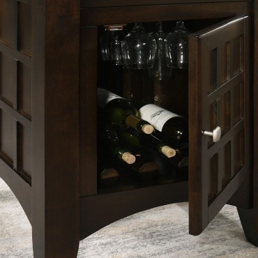 Instill casual charm while enjoying the elevated design details of a transitional counter height dining set. In a rich cappuccino finish, the set centers on a square dining table with an elevated surface that creates space for an open shelf and wine storage cabinet, offering a spot for both stemware and bottles. The shelf is great for utensils and other essentials or for decor that adds personal flair to your dining room. Each side of the cabinet and its door are decorated with grid lattice trim, offering a chic touch of dimension and artistry. Counter chairs feature plush cushions and beige upholstery, with an open cube detail on the back that offers a lightened, airy finishing touch.