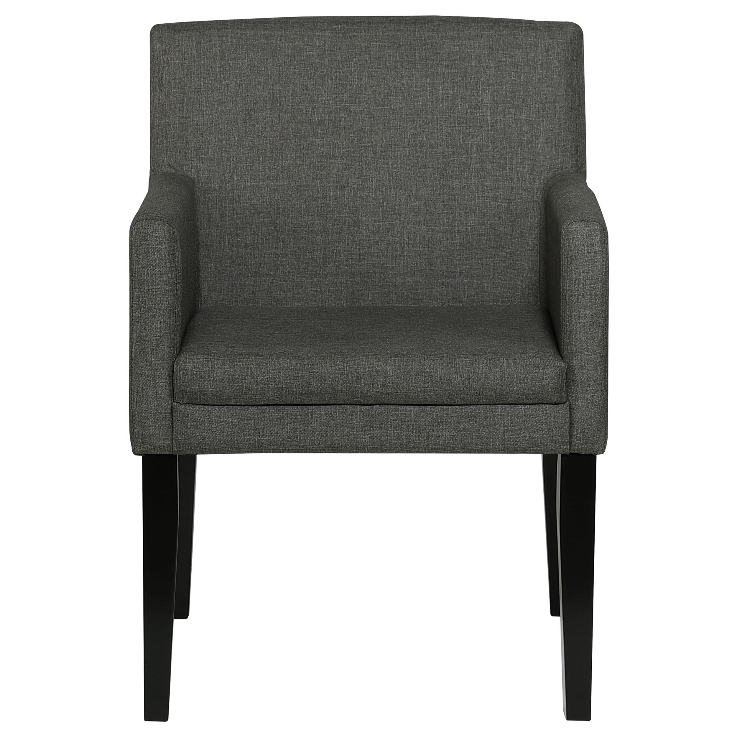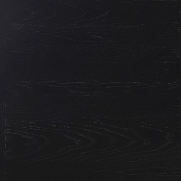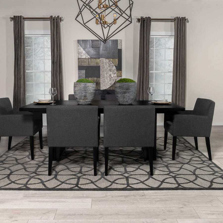 Introducing a beautiful dining room collection with clean, modern lines. The dining table boasts a oak veneer top with a black finish and a stunning tambour base design featuring fluted patterns on the double pedestal legs. The mid-century-inspired dining chairs have cushioned arms wrapped in durable charcoal grey fabric, offering comfort and style for any casual dining room.