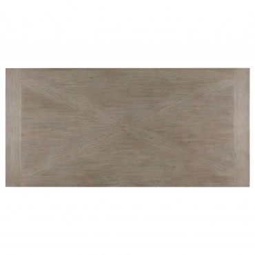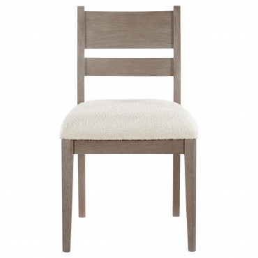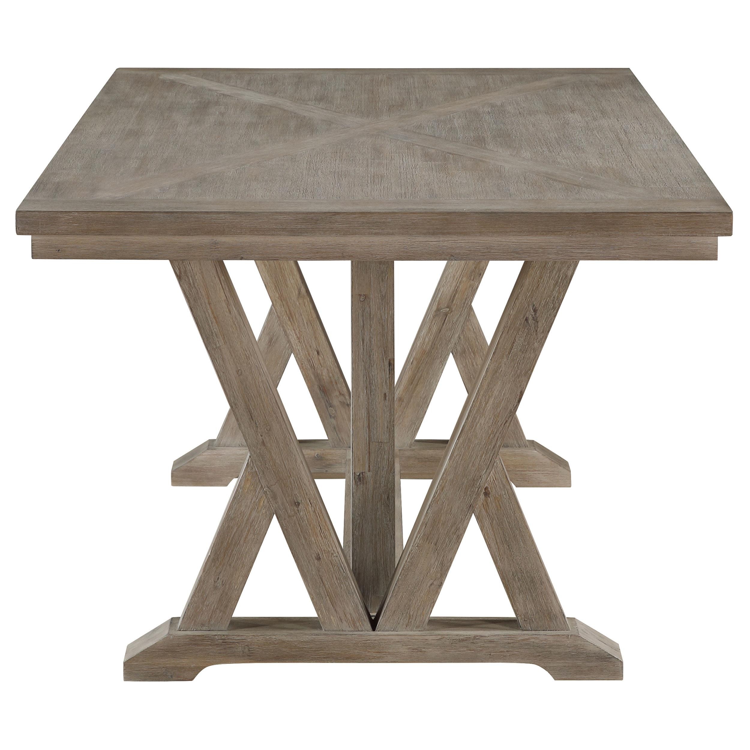 Trestle inspired style brings charming character to a five-piece modern farmhouse dining room set. It focuses on a rectangular dining table, complete with four side chairs that create a cohesive look with a casual coastal grey finish. Cream upholstery adds a fresh, bright touch, perfect for an inviting kitchen or dining room. Chairs feature modified ladder backs, offering artisan appeal, while the decorative table base instills the perfect touch of dimensionality. Foam padding adds comfort to seats, perfect for family and friends to enjoy a meal and conversation.