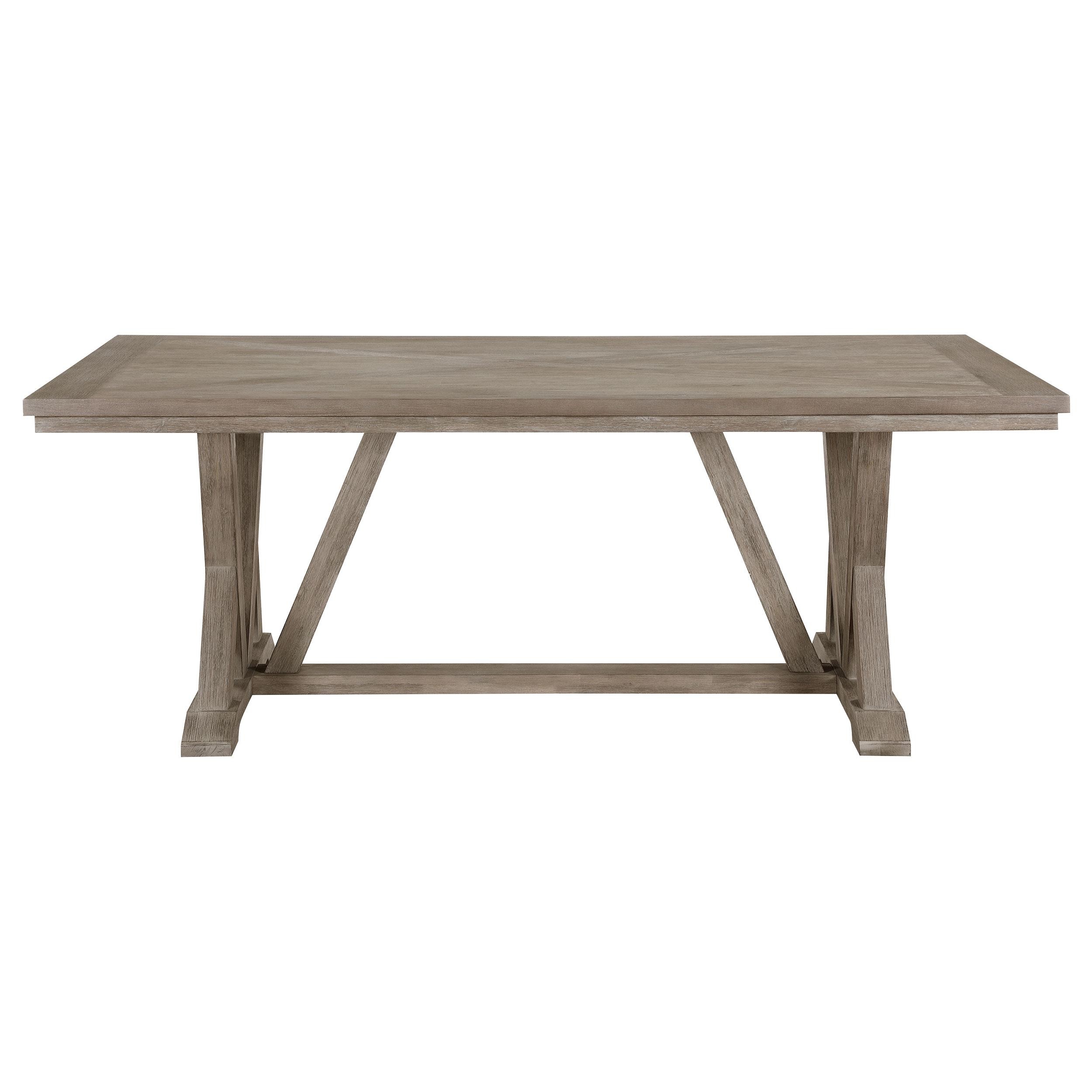 Build an inviting kitchen or dining room with this seven-piece modern farmhouse dining set at its heart. Designed for casual ambiance, it features a rectangular dining table complete with a trestle base with angular details that are sure to draw the eye. A coastal grey finish complements acacia veneer over acacia wood and MDF, creating a strong, durable set that's built to last. The table is a rectangular design to comfortably seat six, perfect for the family or entertaining friends. Six side chairs add modified ladder backs for depth and texture, with creamy upholstery fabric over foam padded seats for exceptional comfort.
